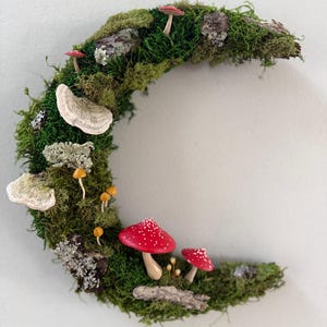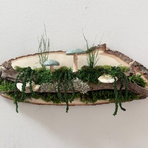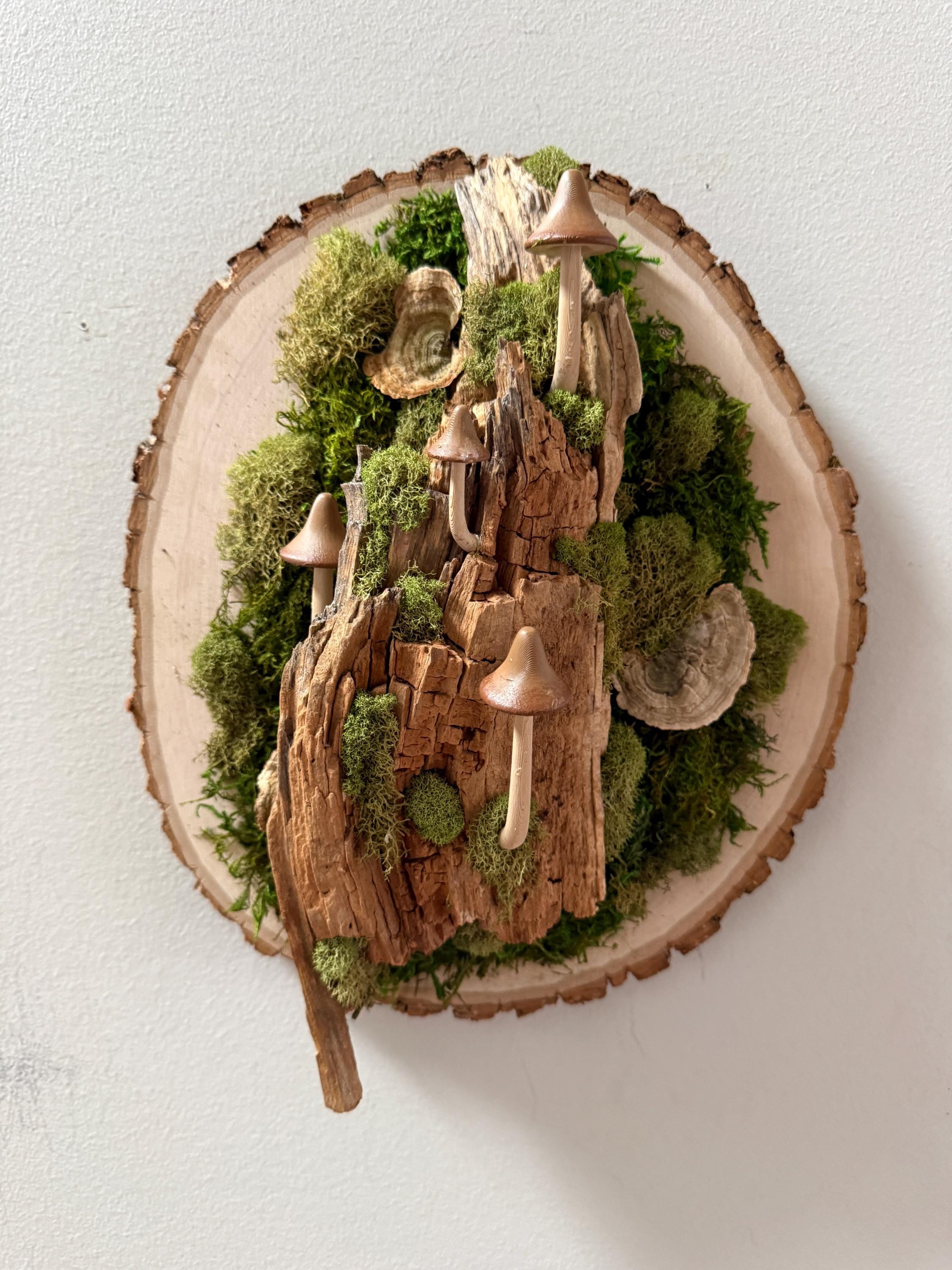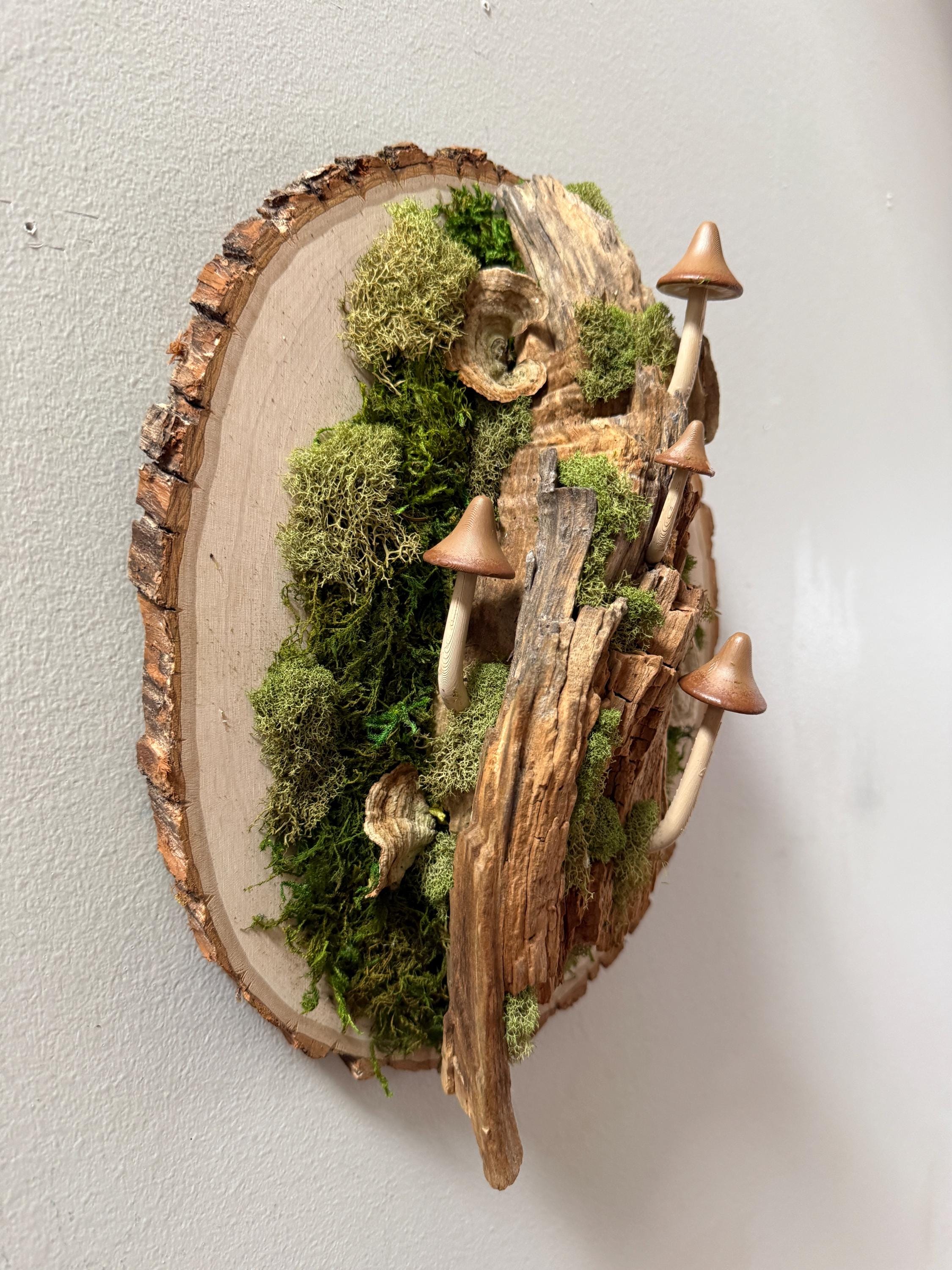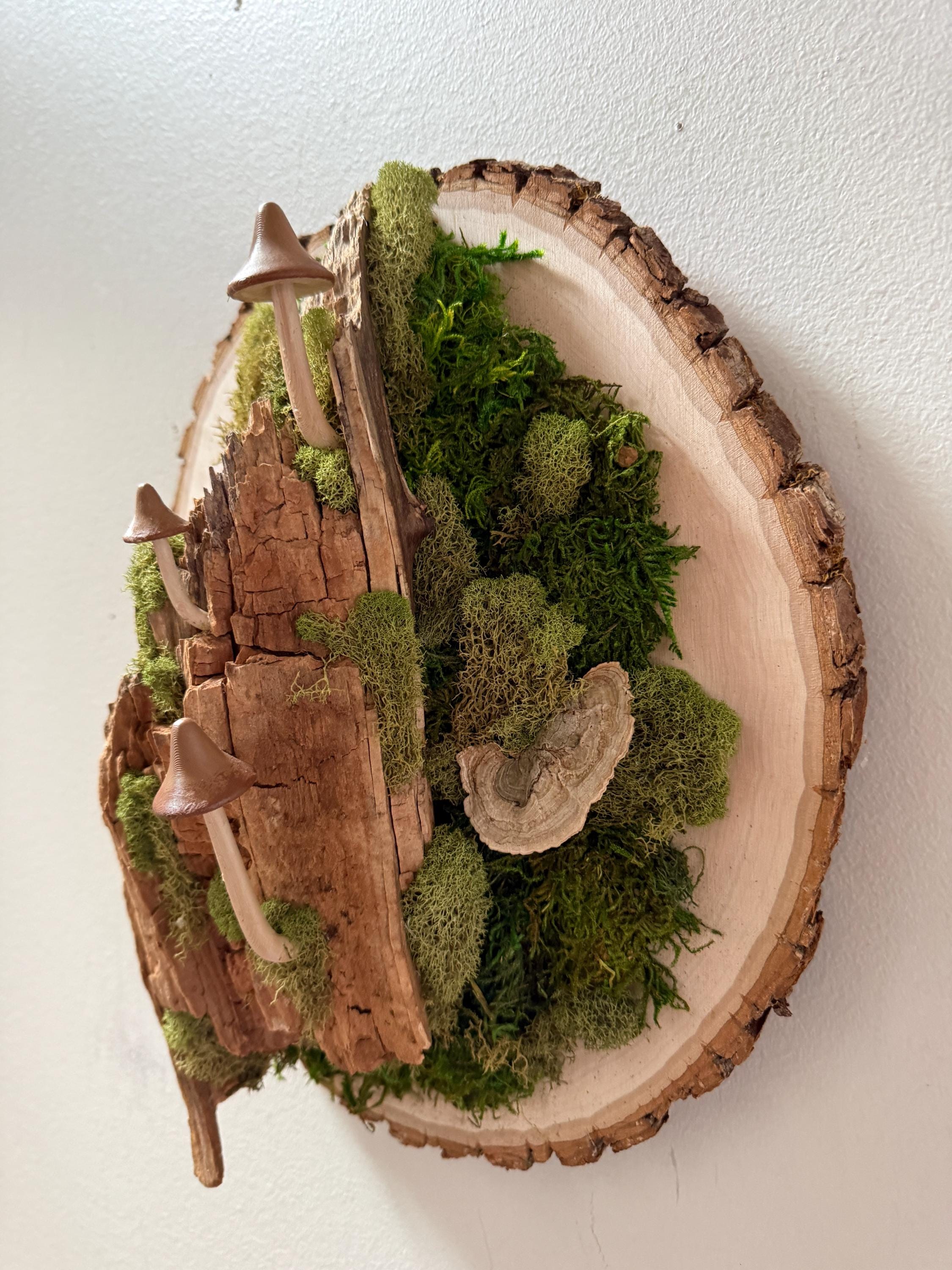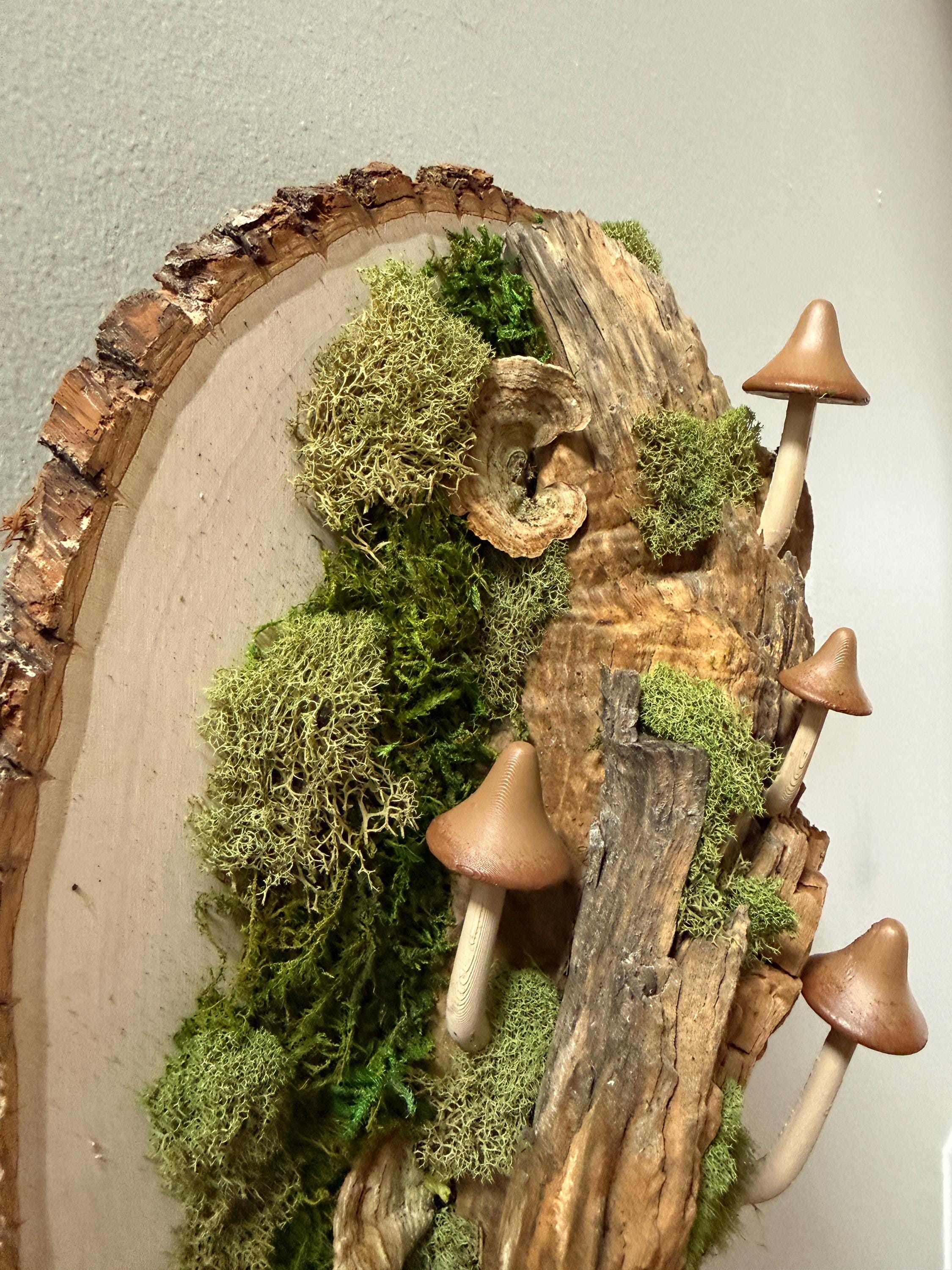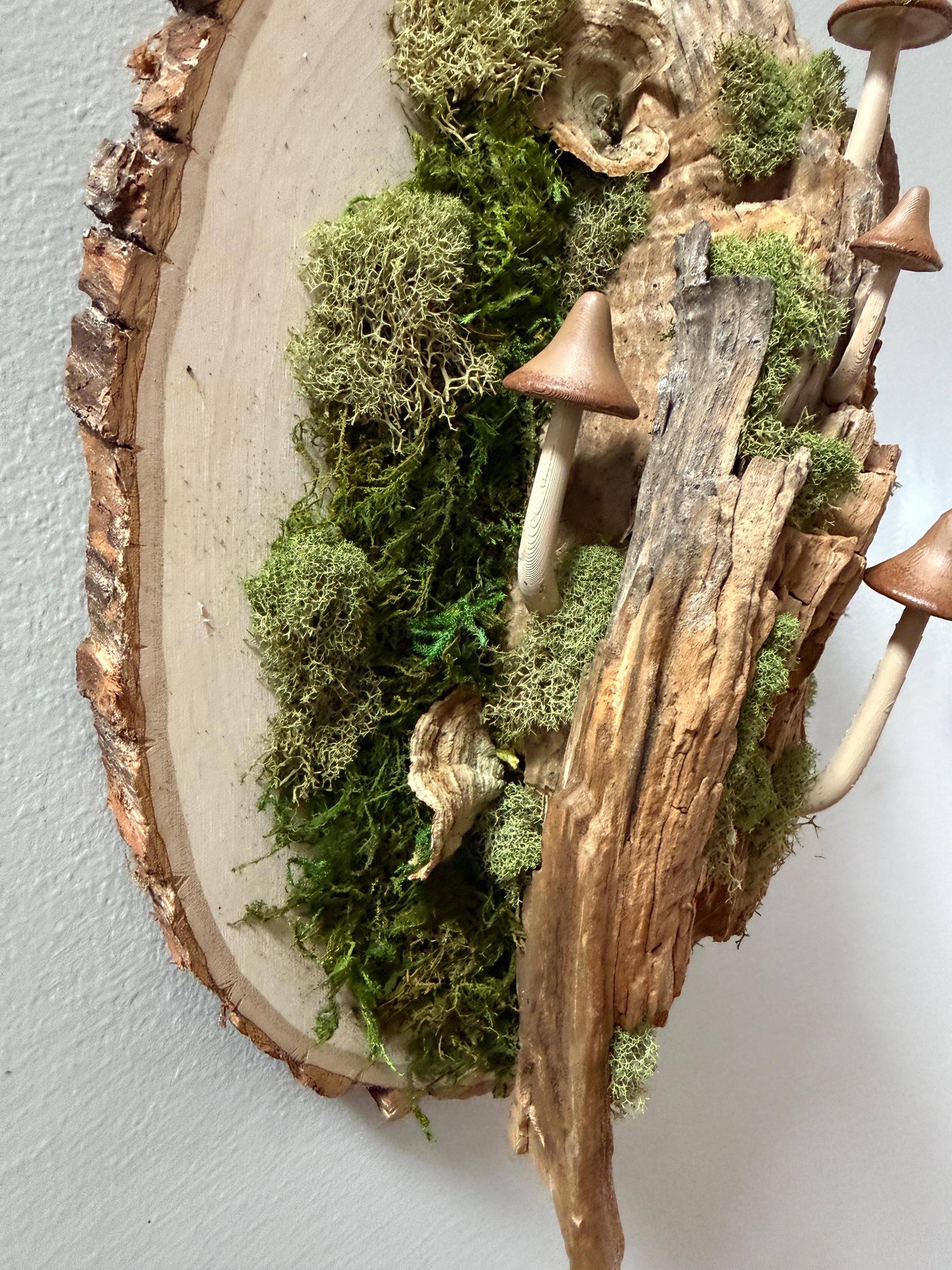It starts with a really unique piece of hardwood, then comes the moss, lichen, dried mushrooms and some hand-painted mushrooms. This piece is 3 dimensional and looks great from every angle. Hang a piece of the forest on your wall.