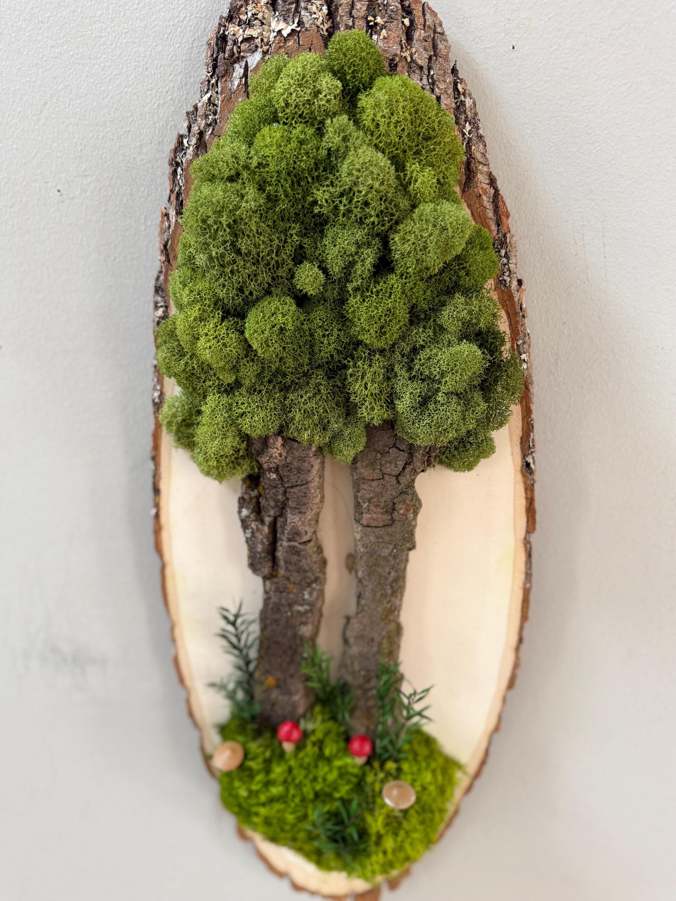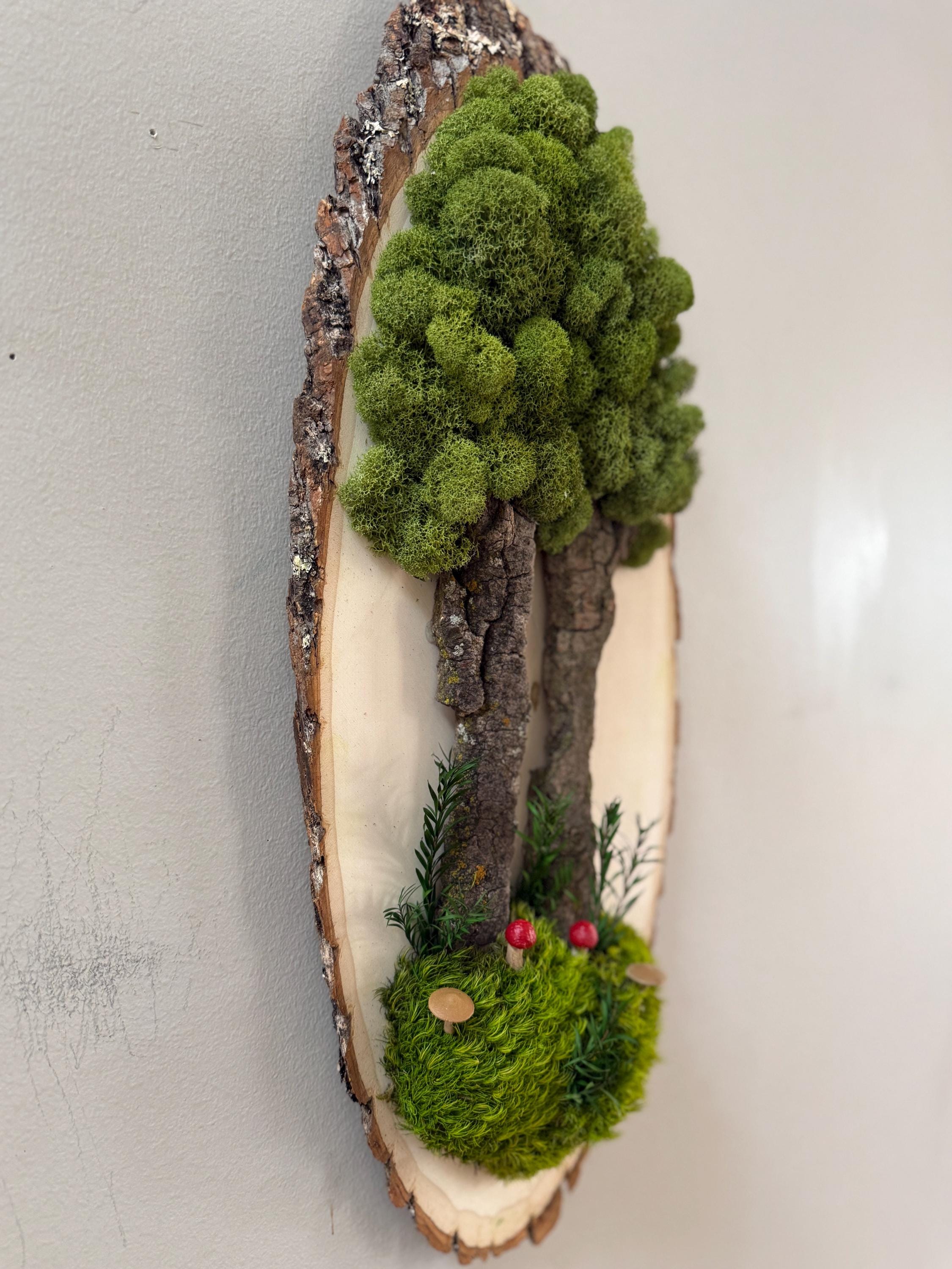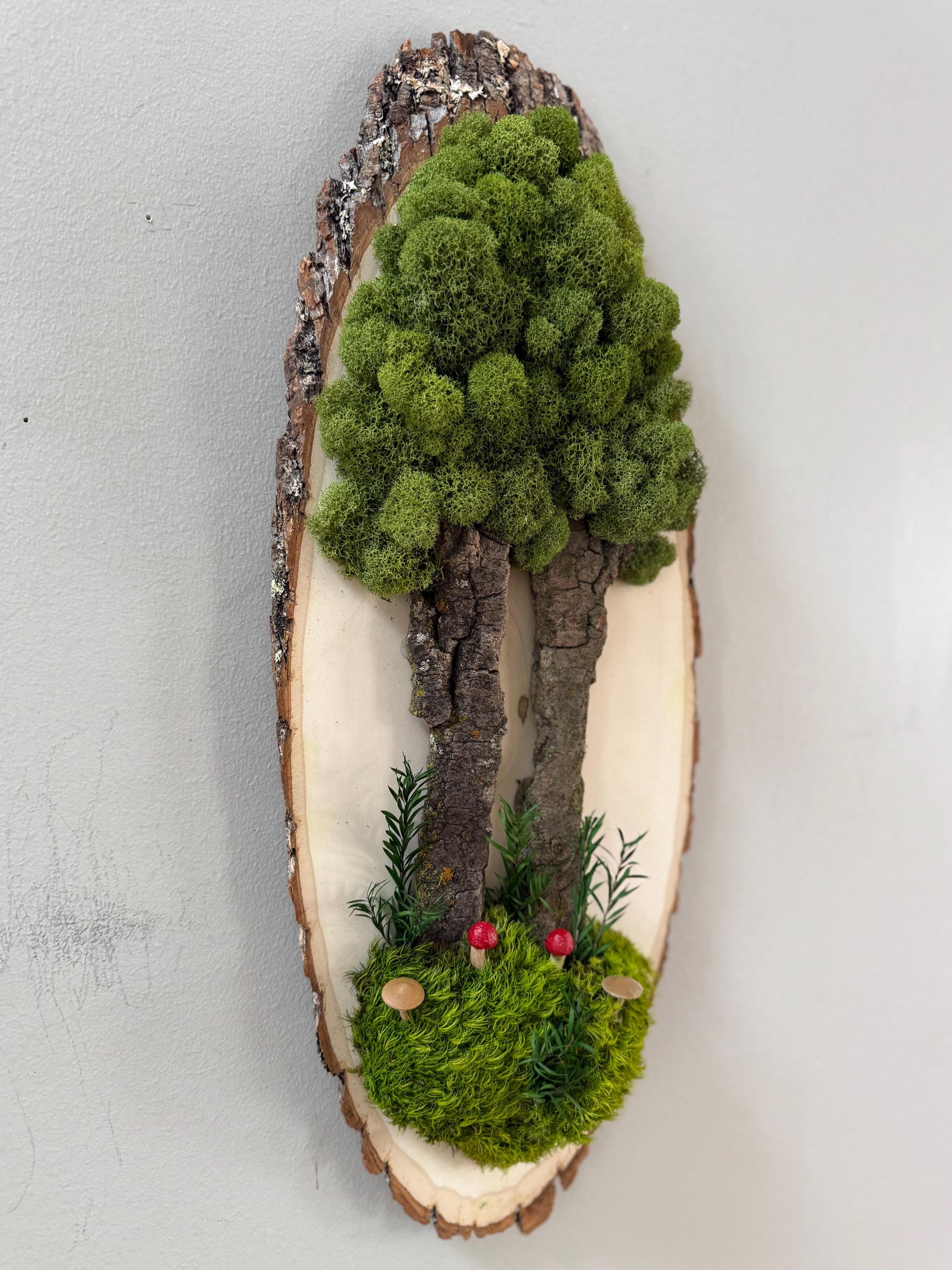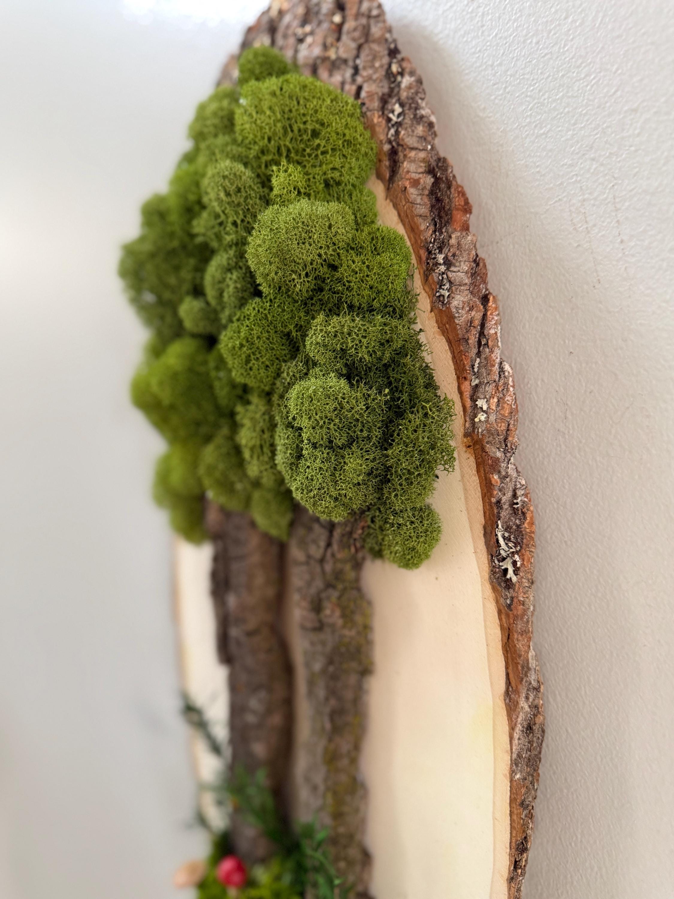 This "tree" was created with a gorgeous piece of dried bark and preserved mosses. All natural dried and preserved botanicals. Lovely, large wall hanging on a real wood slice with raw bark edge. All materials are preserved so no maintenance is required.
