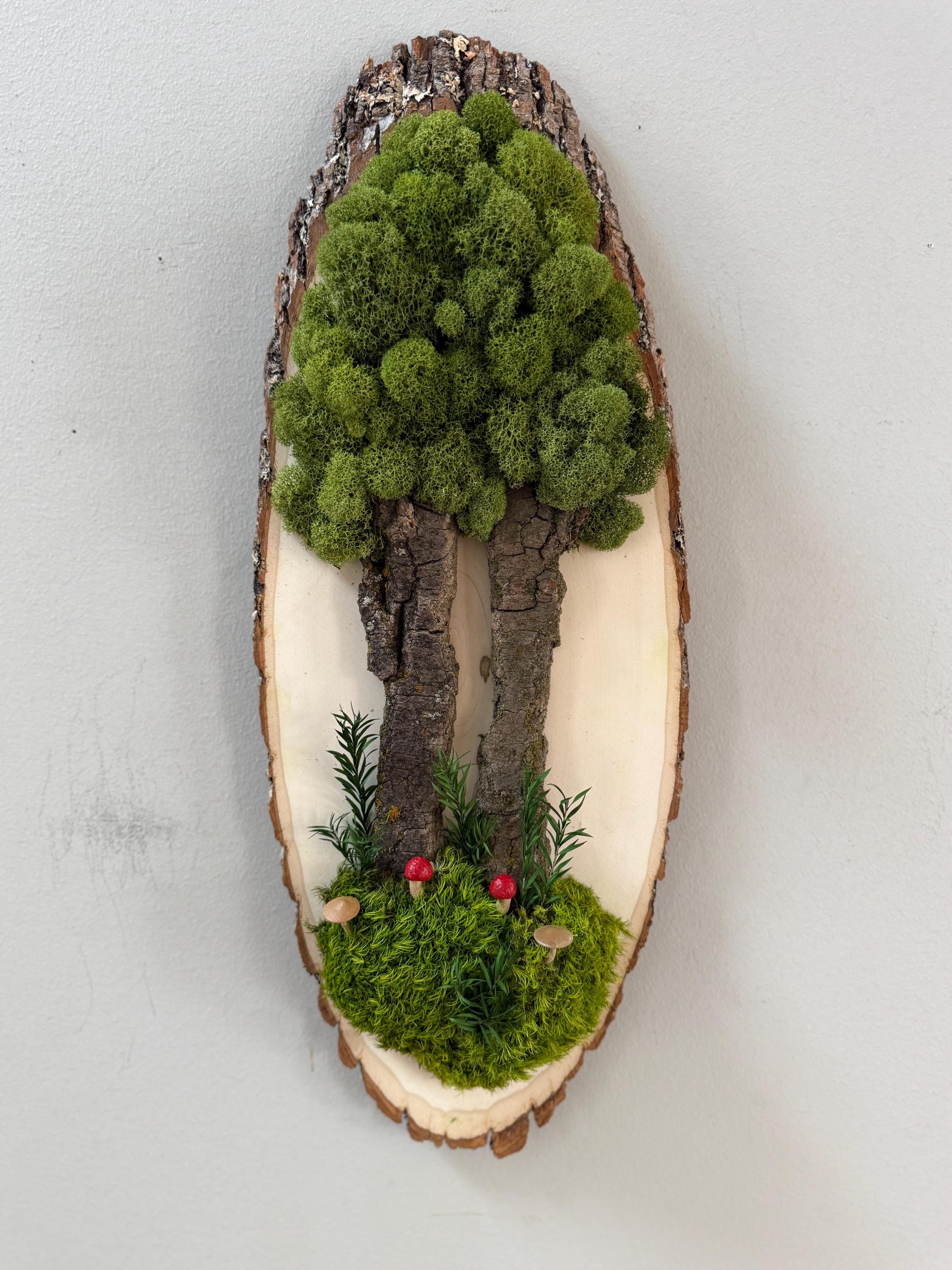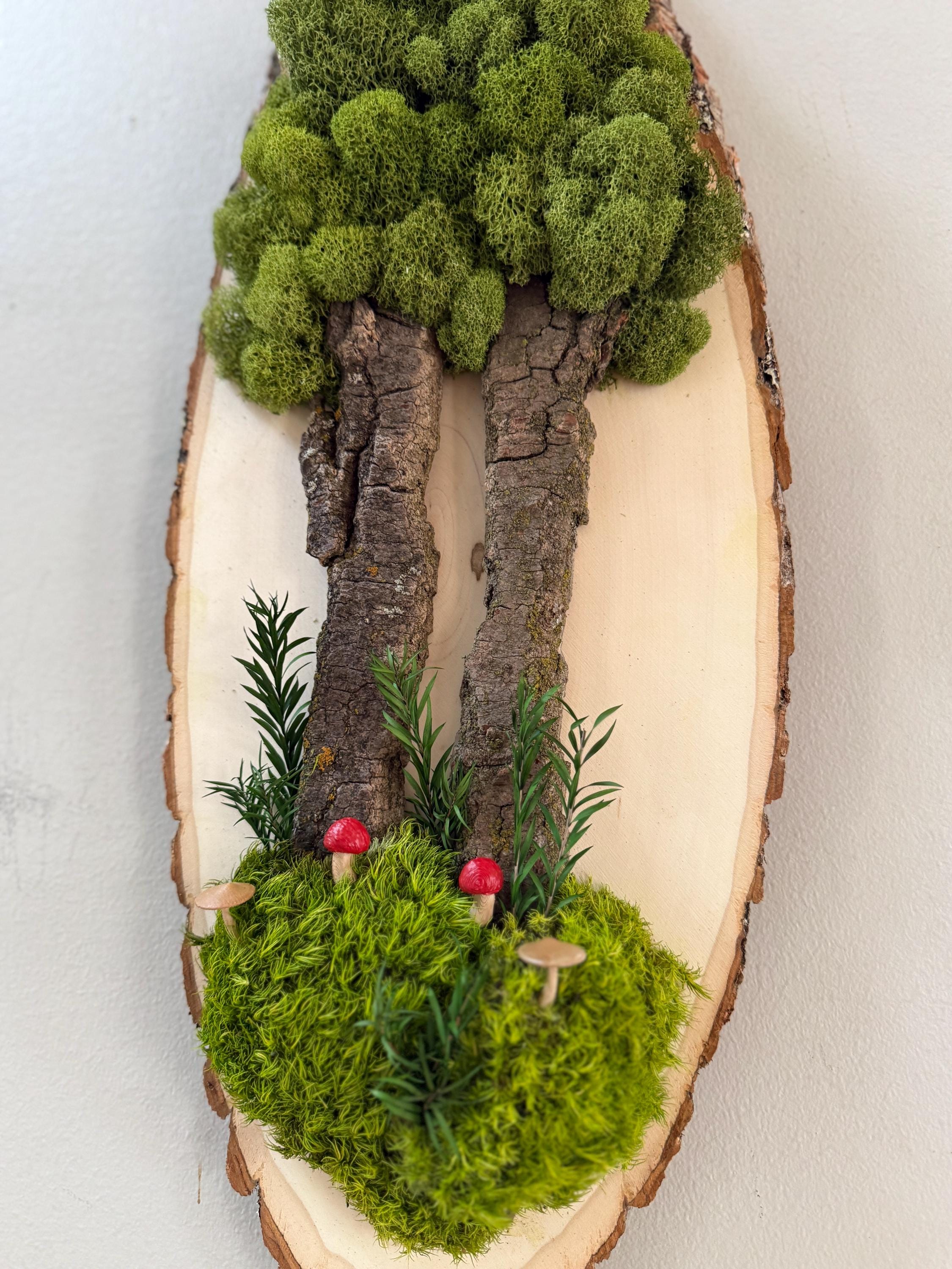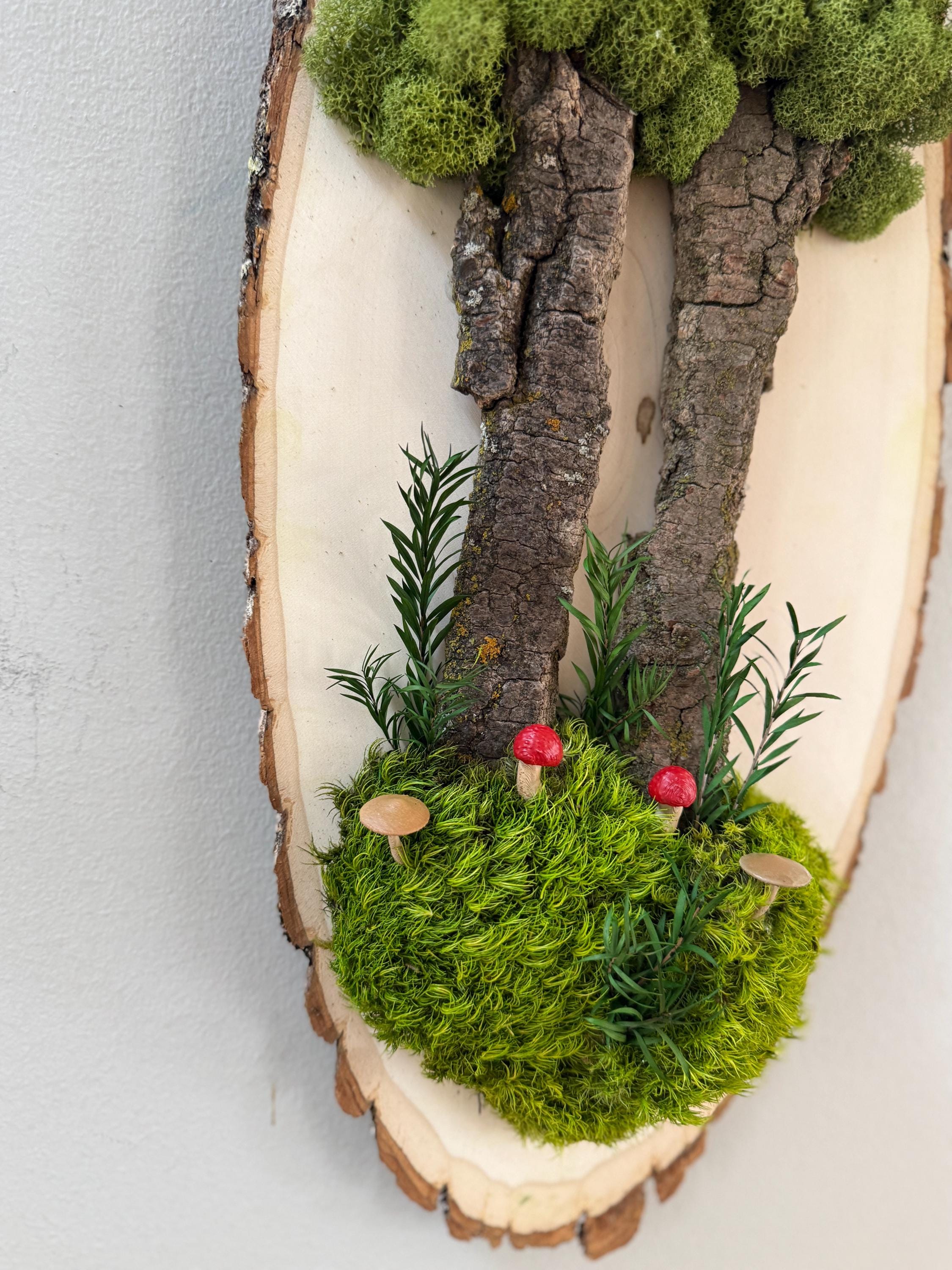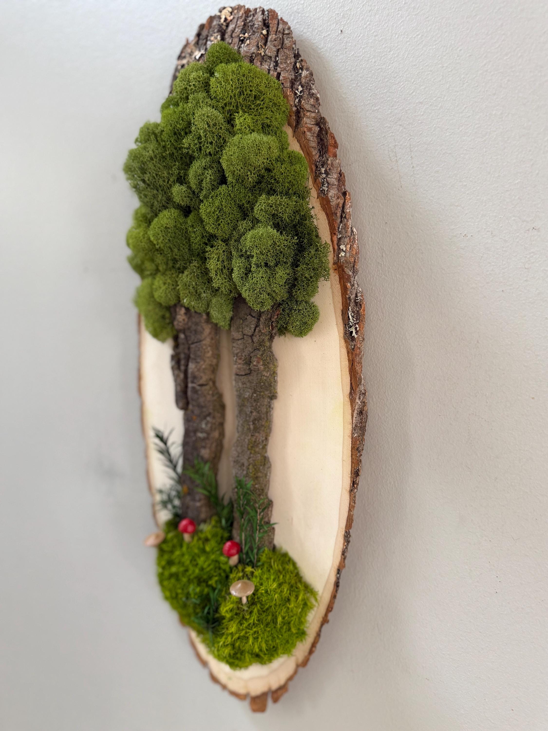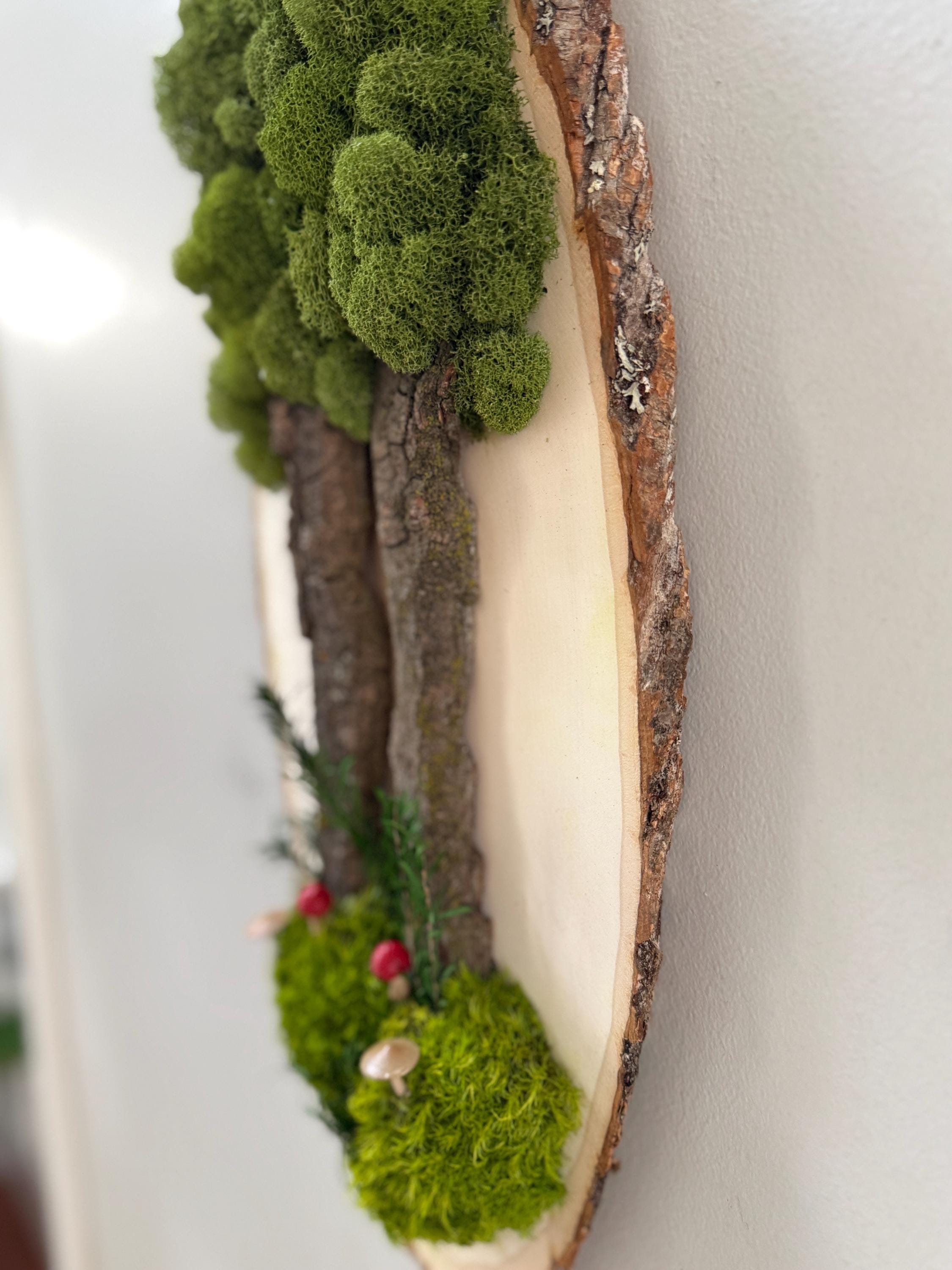 This "tree" was created with a gorgeous piece of dried bark and preserved mosses. All natural dried and preserved botanicals. Lovely, large wall hanging on a real wood slice with raw bark edge. All materials are preserved so no maintenance is required.