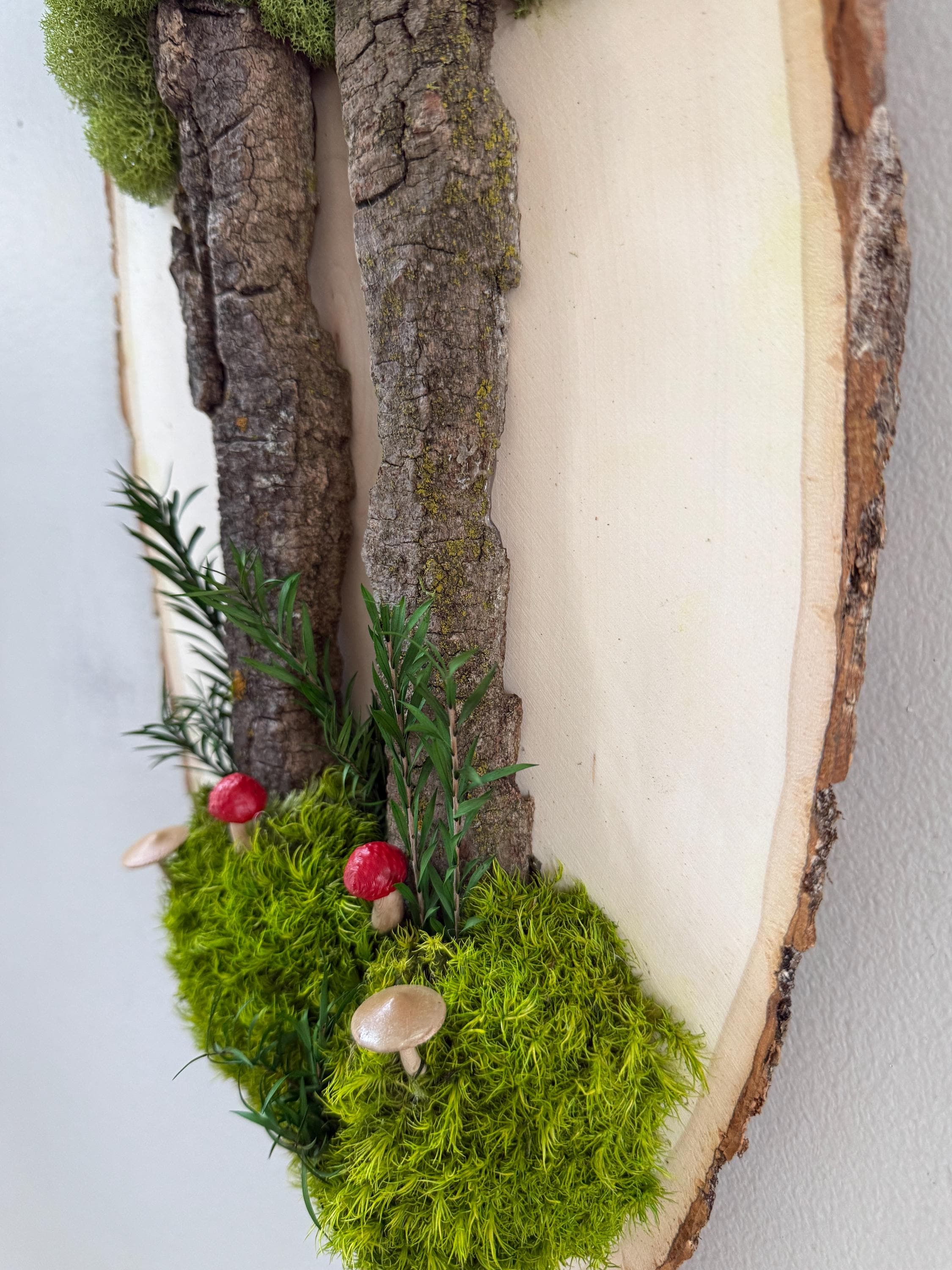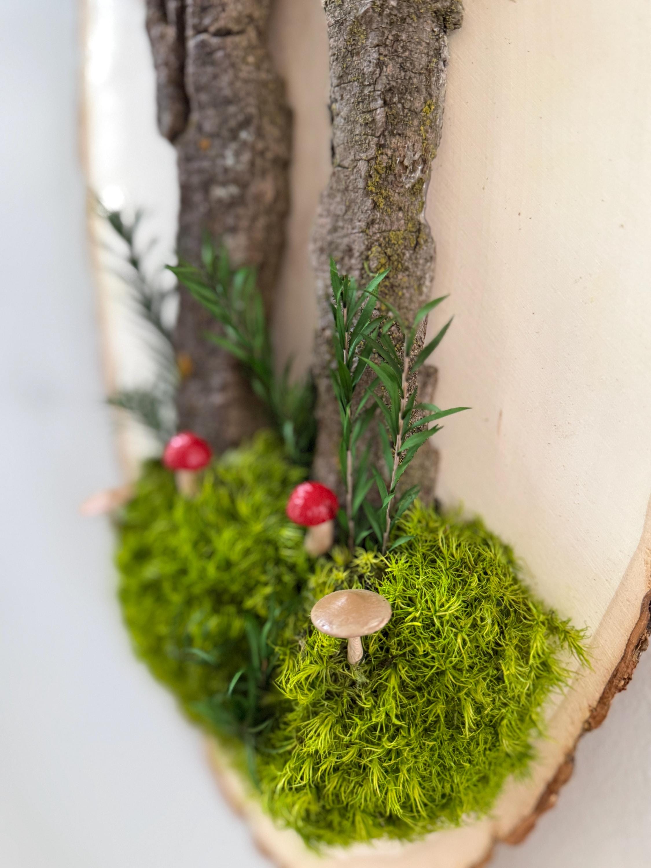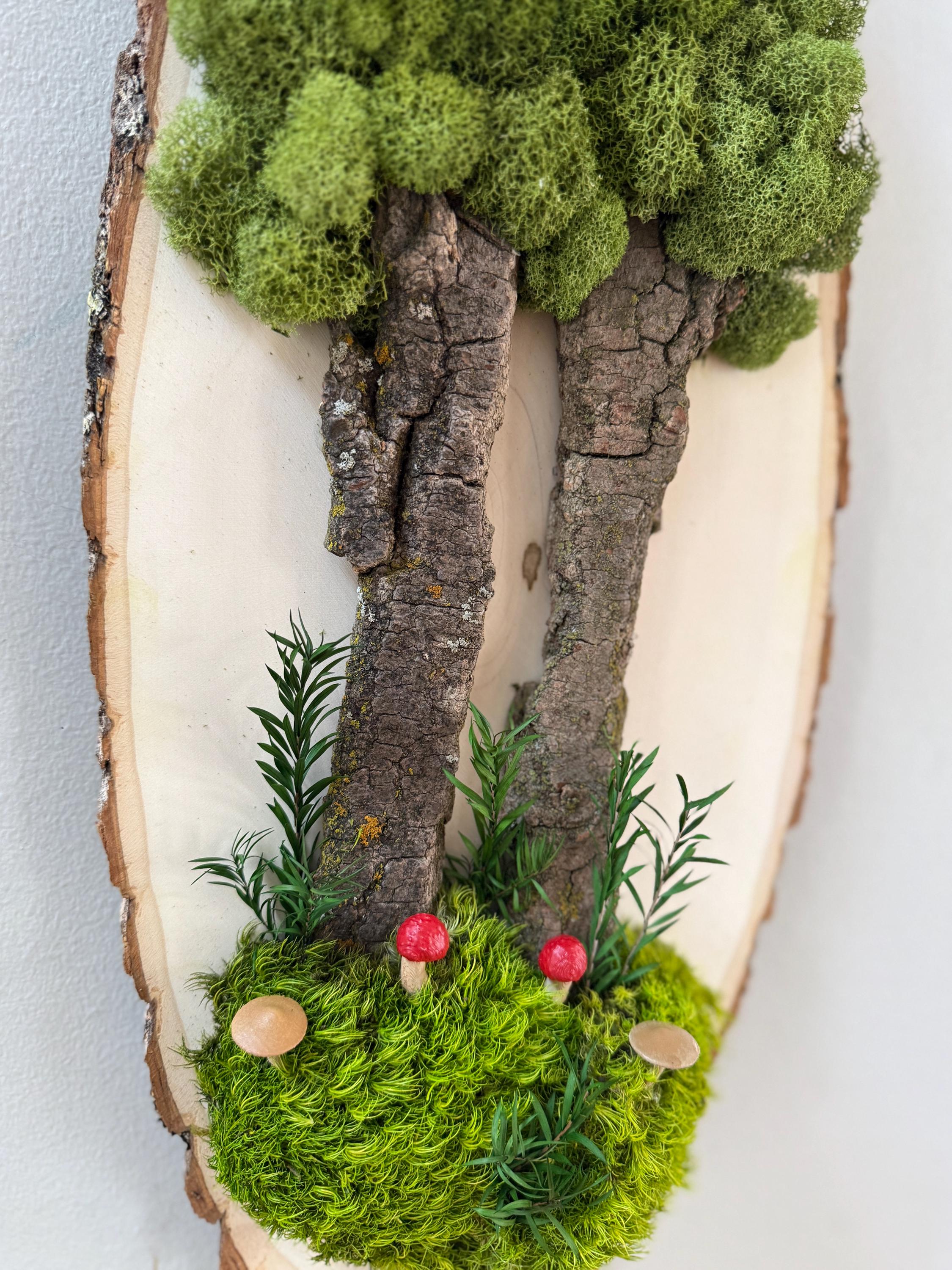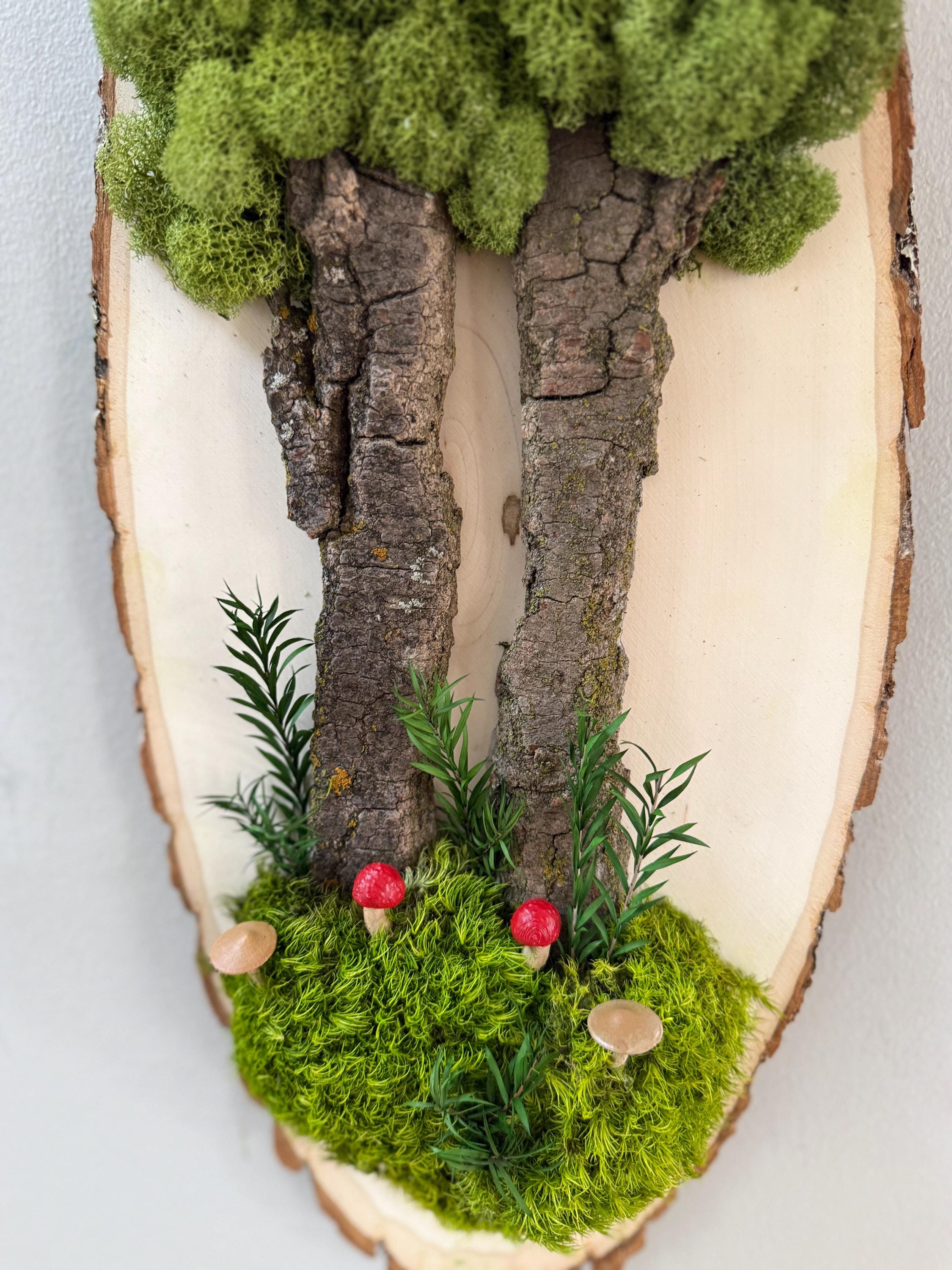 This "tree" was created with a gorgeous piece of dried bark and preserved mosses. All natural dried and preserved botanicals. Lovely, large wall hanging on a real wood slice with raw bark edge. All materials are preserved so no maintenance is required.