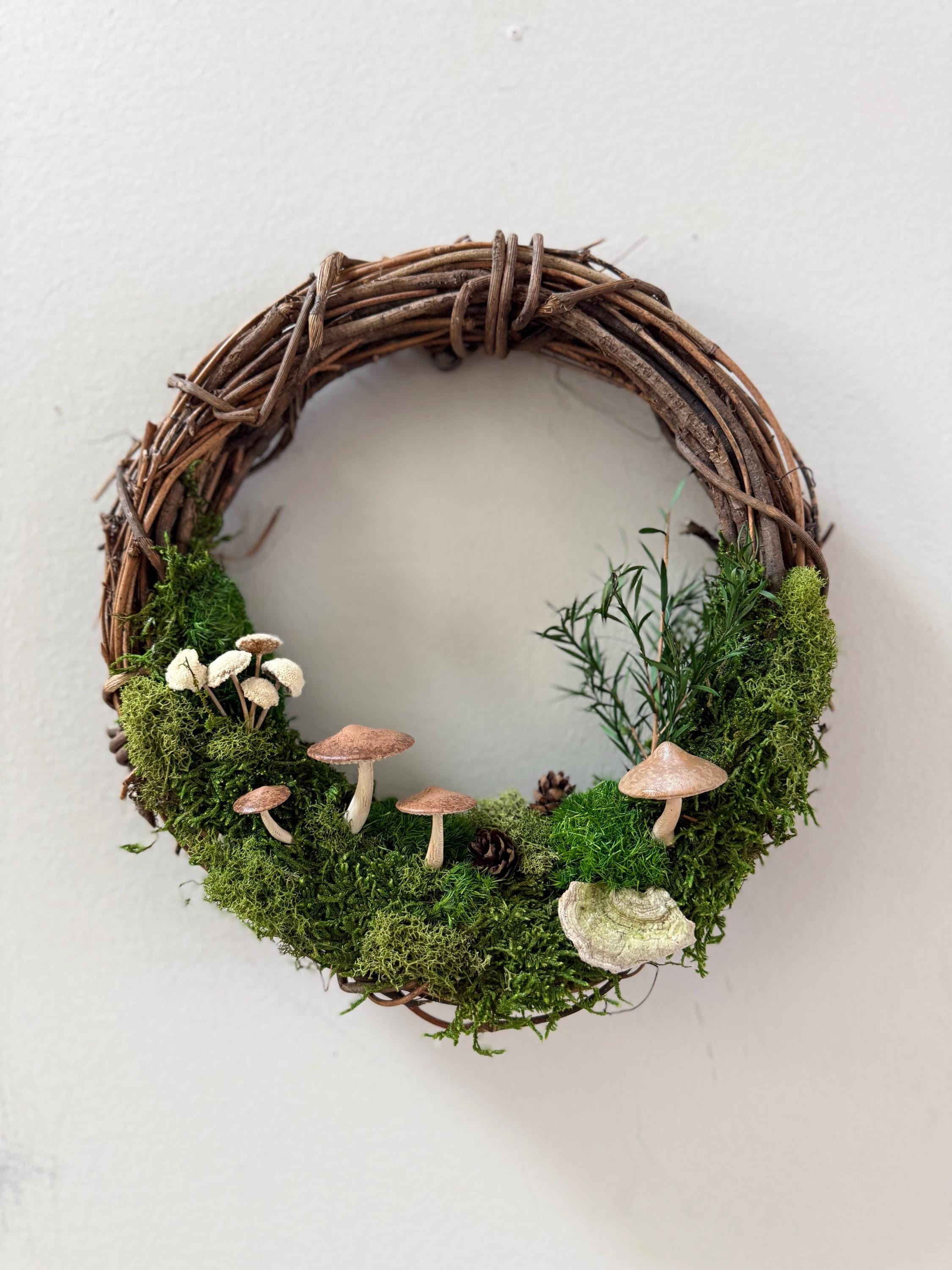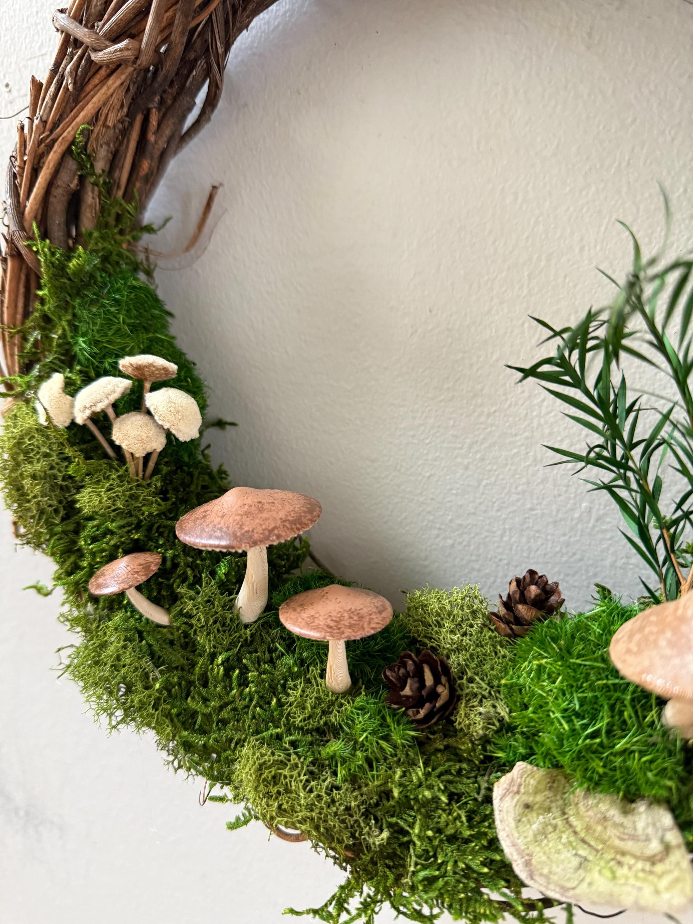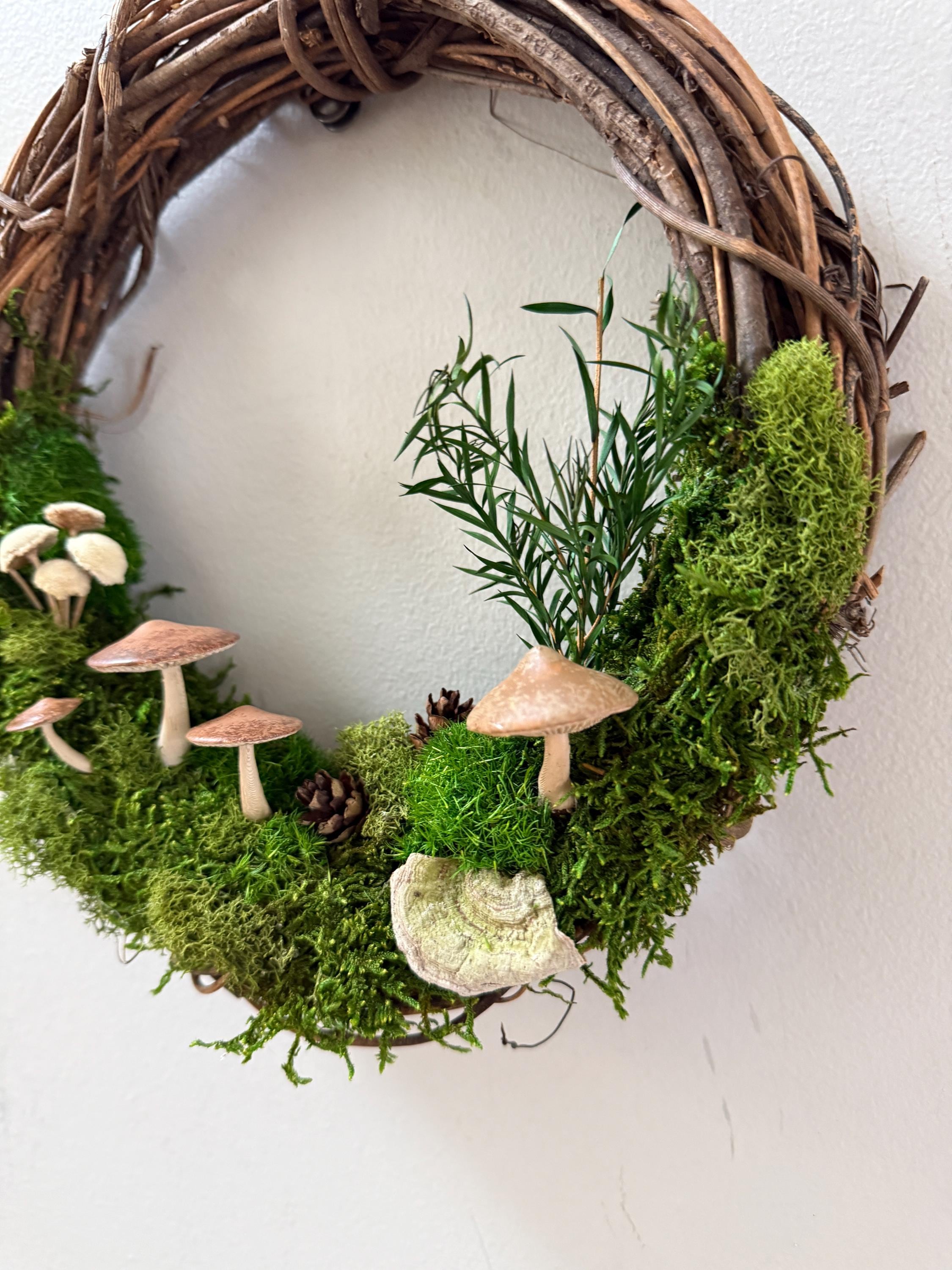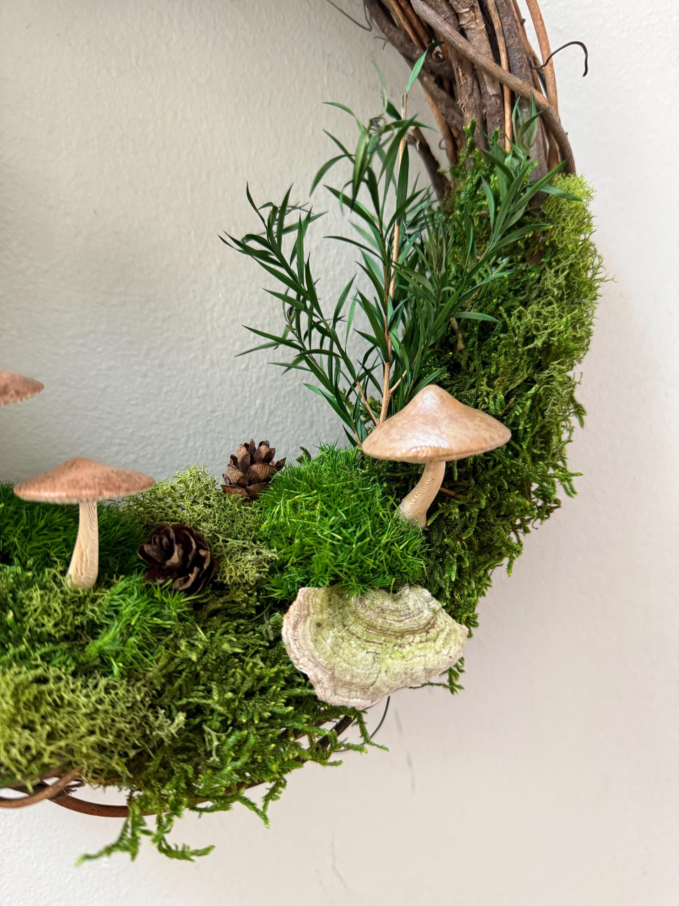 :: This piece is made using preserved natural mosses and lichen, so no care or watering is required. It will stay green and lush forever! :: Handpainted mushrooms are 3D printed in a eco-friendly, plant based and compostable PLA. :: Natural grapevine wreath measures 10 inches in diameter. :: Small hanging loop on the back. :: Made by hand in Michigan