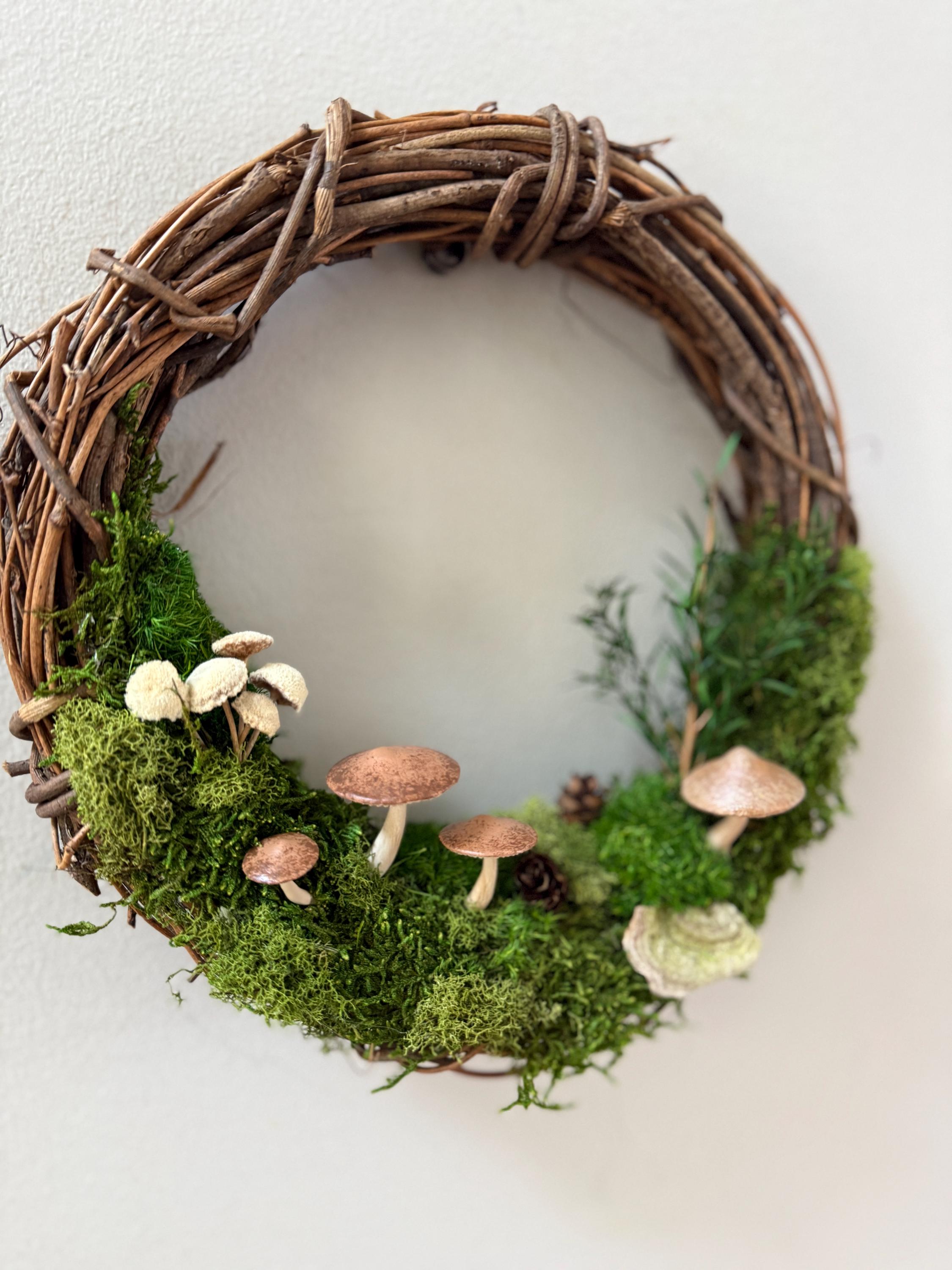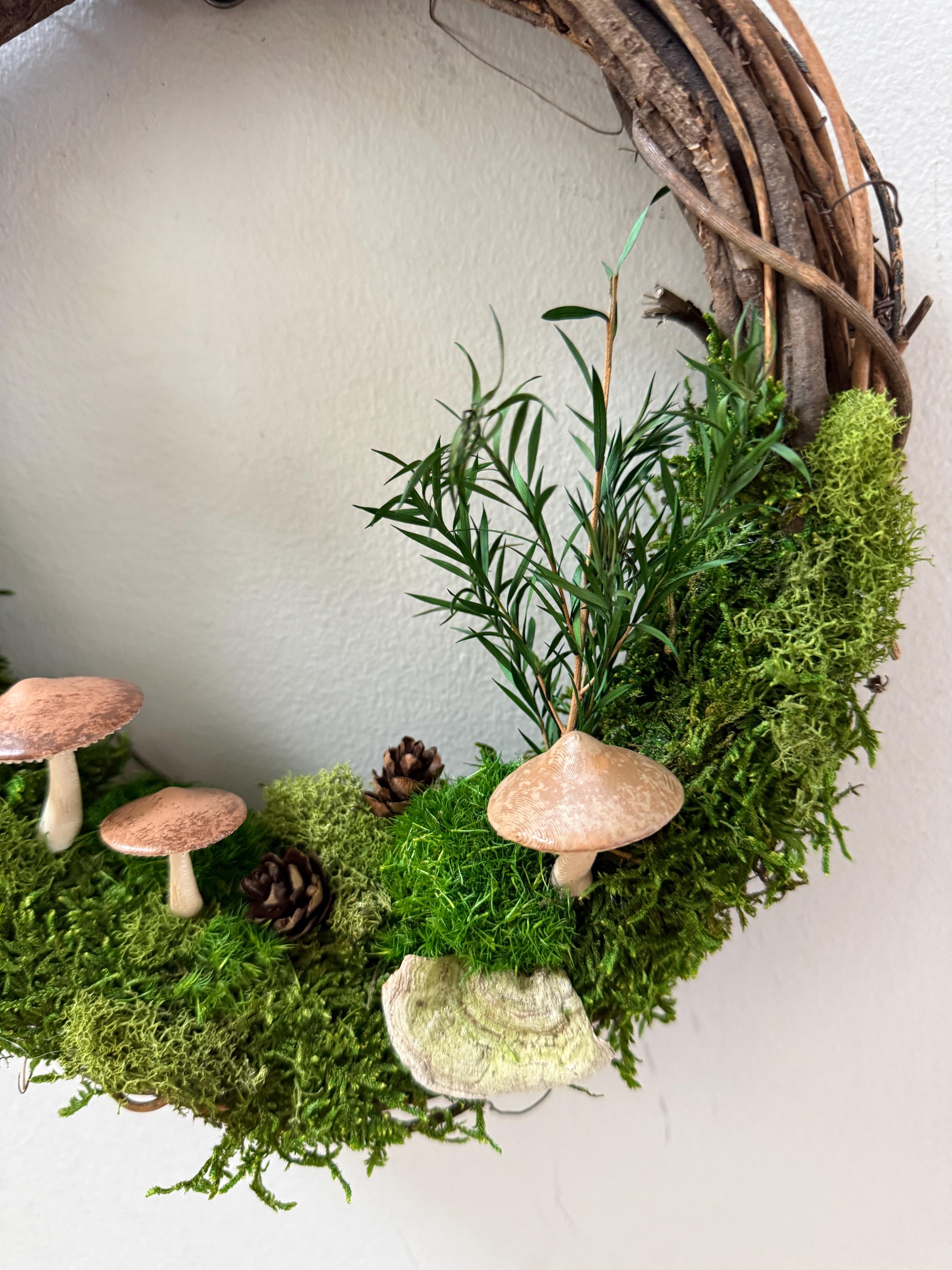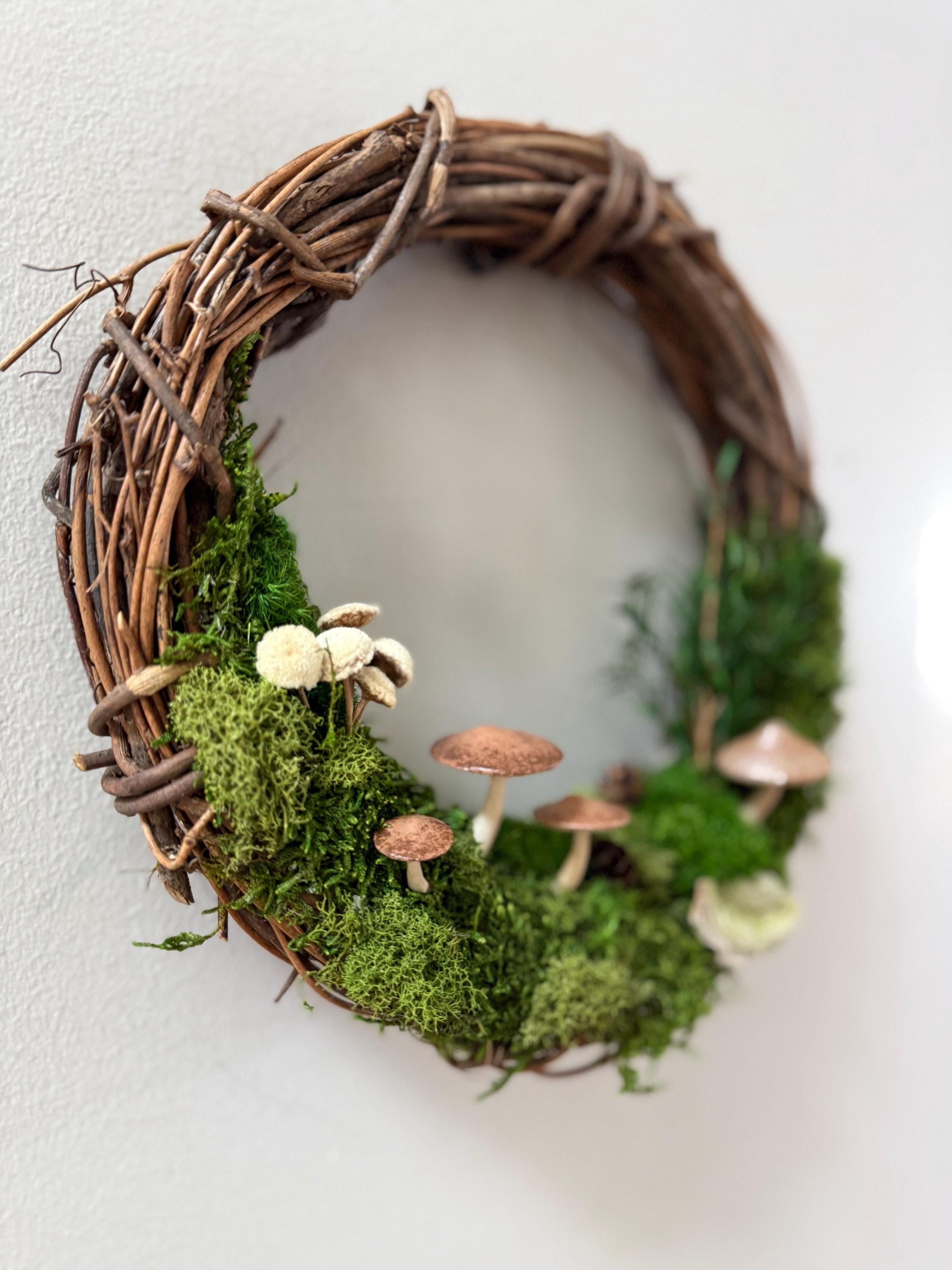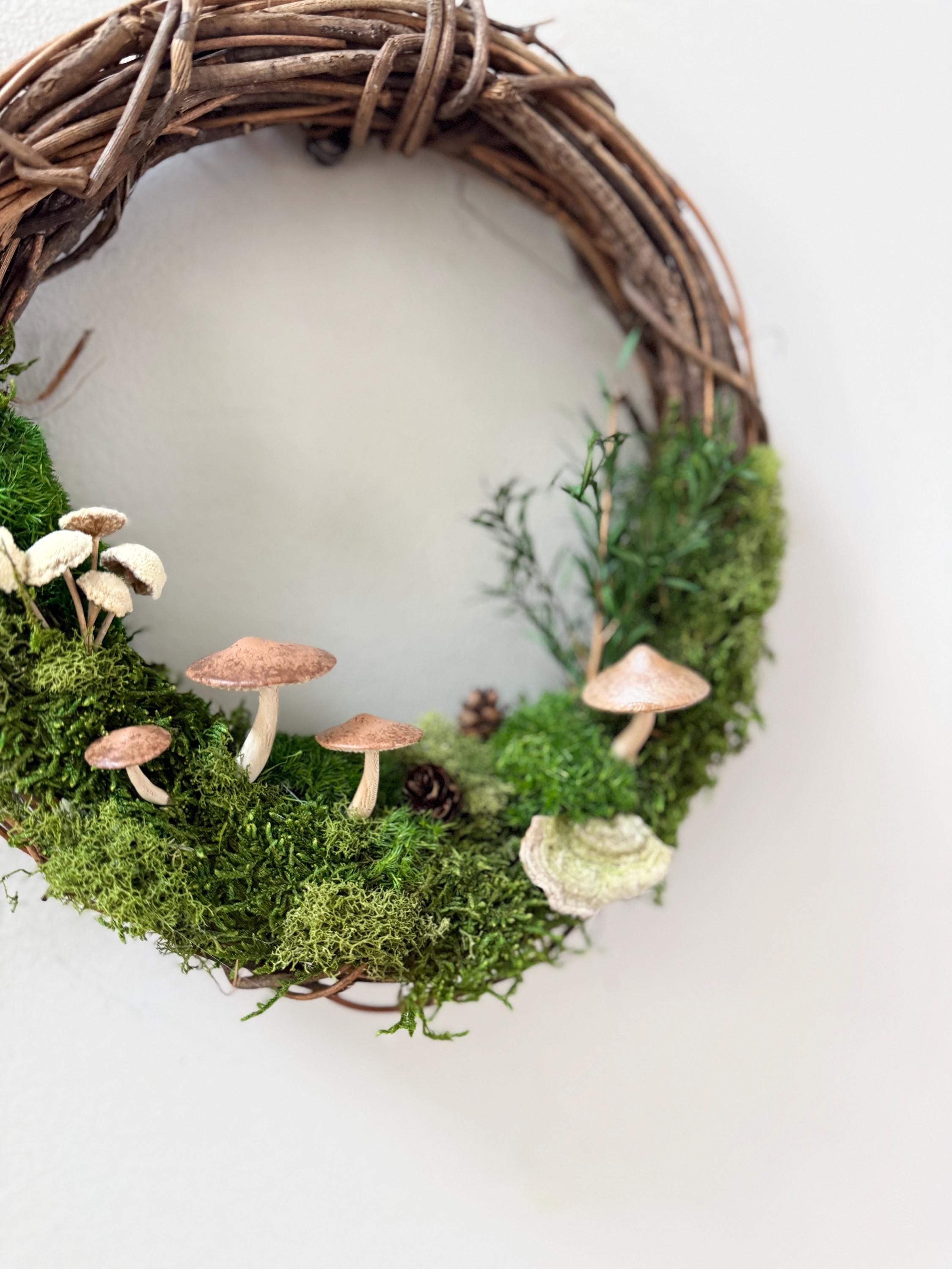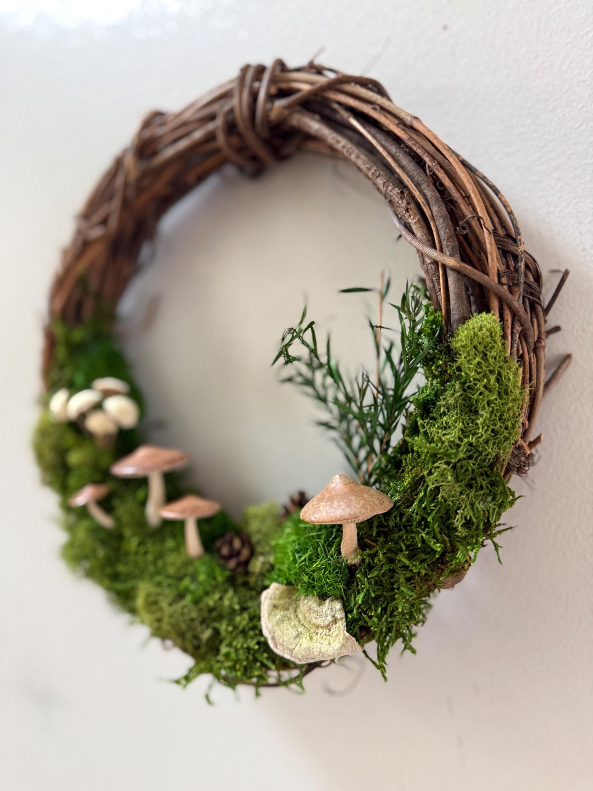 :: This piece is made using preserved natural mosses and lichen, so no care or watering is required. It will stay green and lush forever! :: Handpainted mushrooms are 3D printed in a eco-friendly, plant based and compostable PLA. :: Natural grapevine wreath measures 10 inches in diameter. :: Small hanging loop on the back. :: Made by hand in Michigan