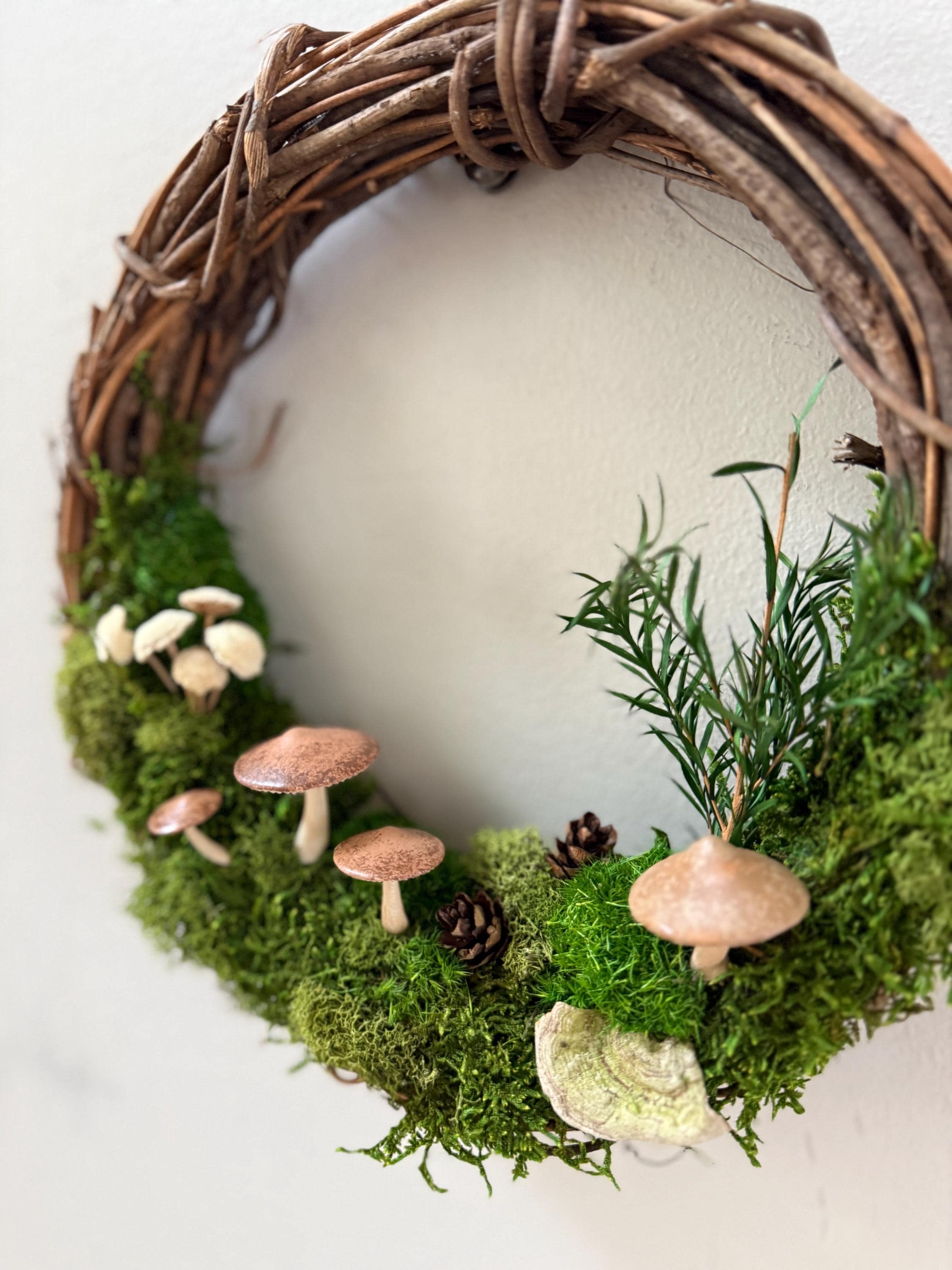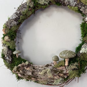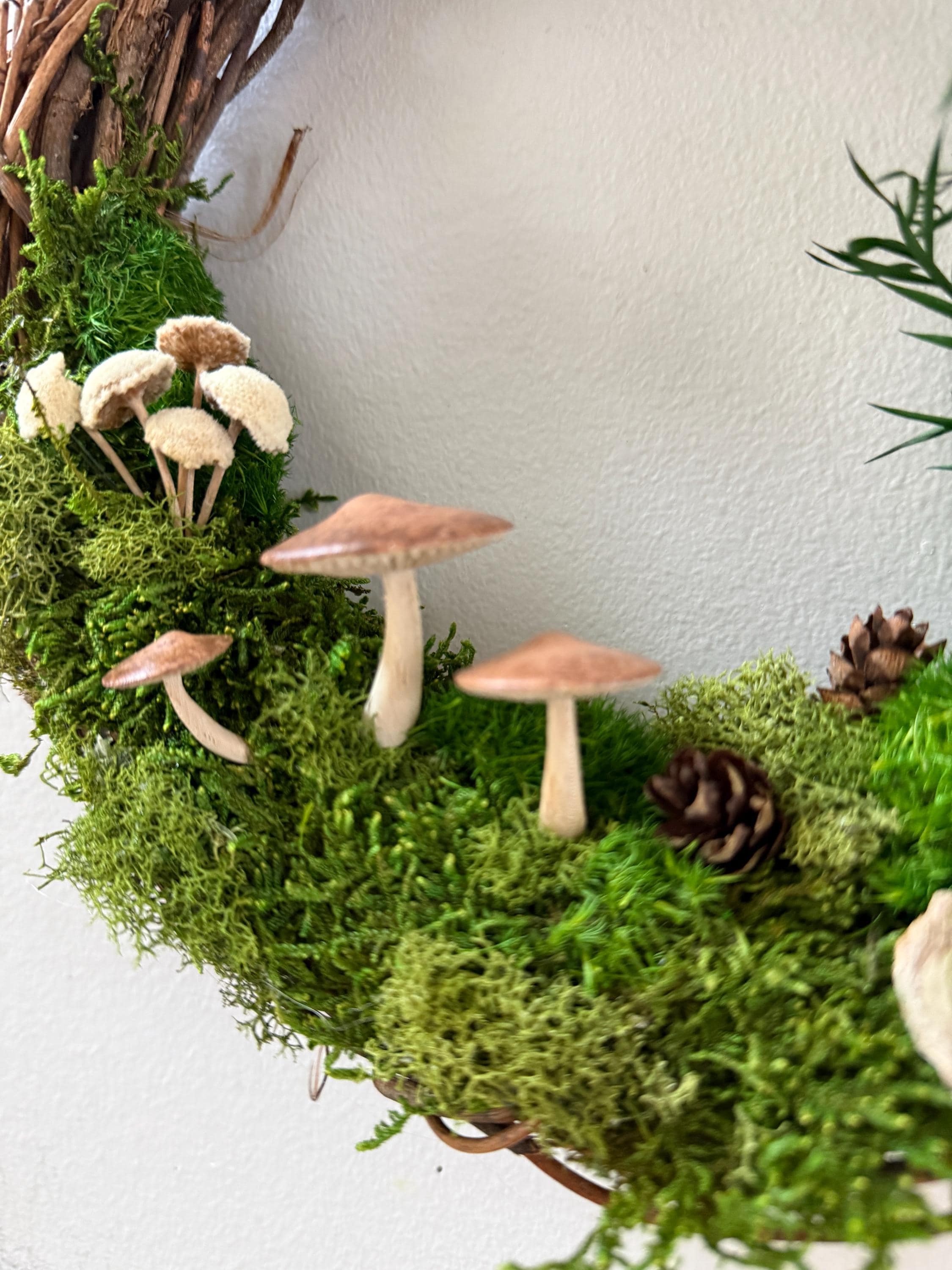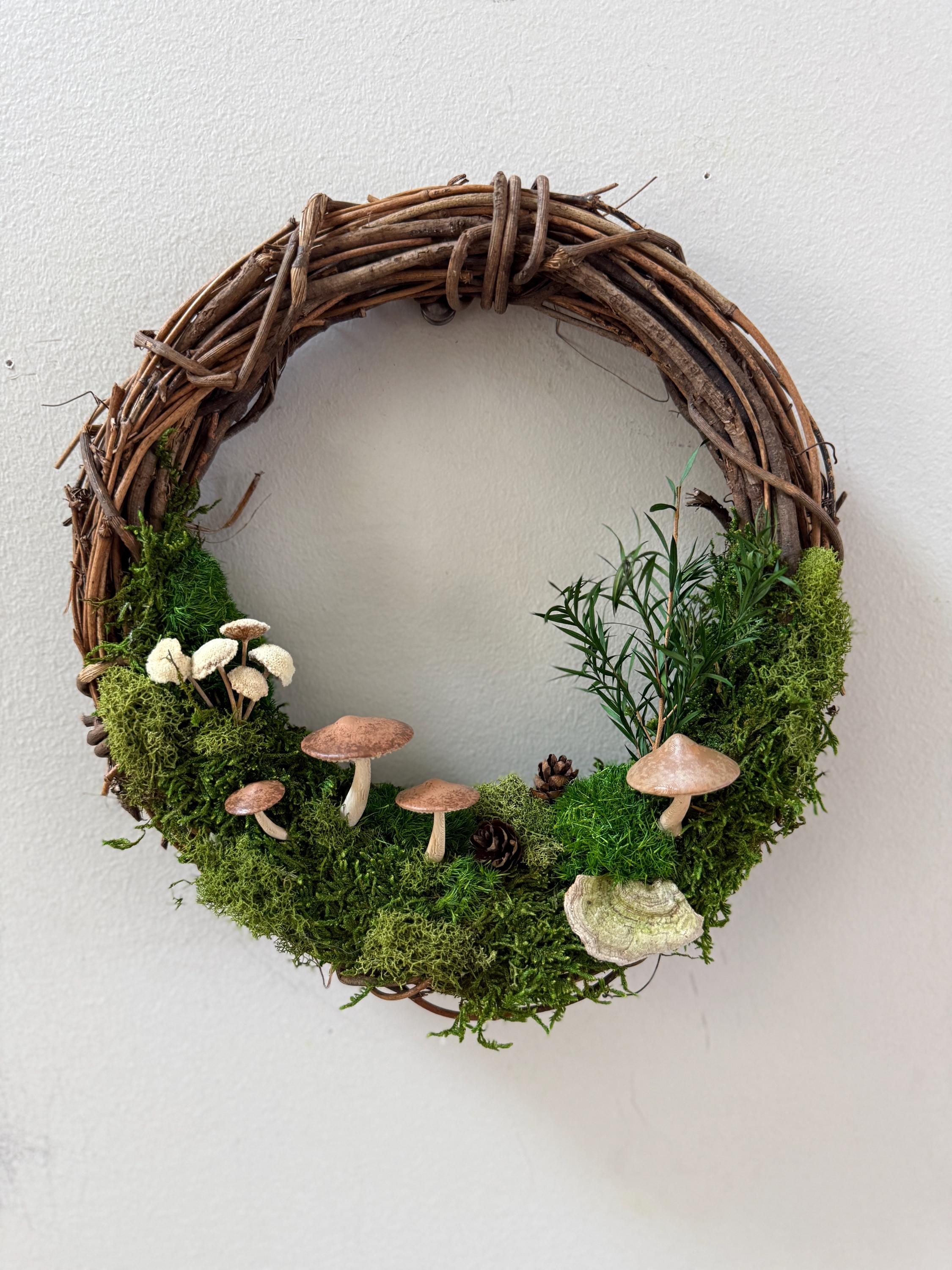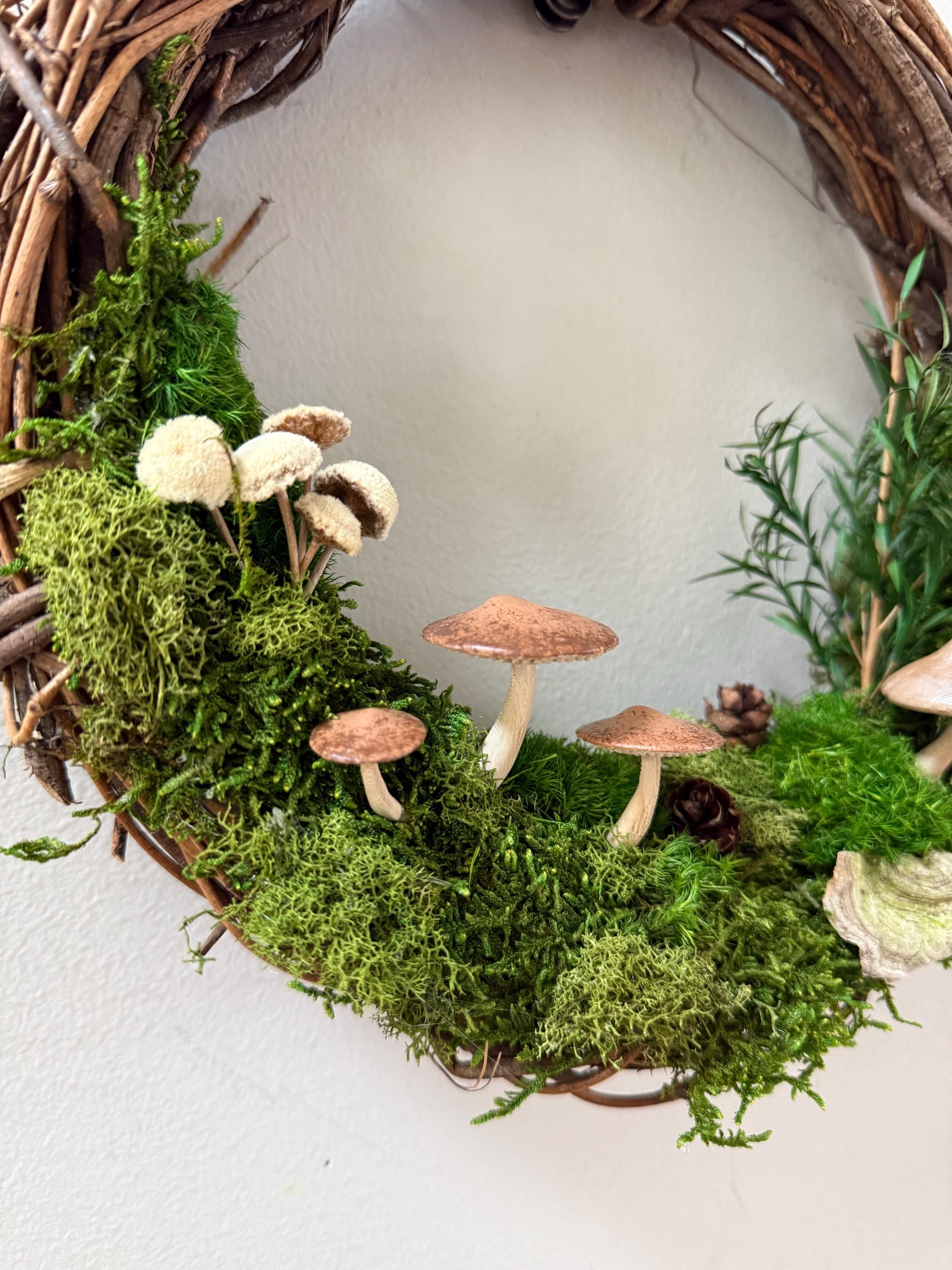 :: This piece is made using preserved natural mosses and lichen, so no care or watering is required. It will stay green and lush forever! :: Handpainted mushrooms are 3D printed in a eco-friendly, plant based and compostable PLA. :: Natural grapevine wreath measures 10 inches in diameter. :: Small hanging loop on the back. :: Made by hand in Michigan