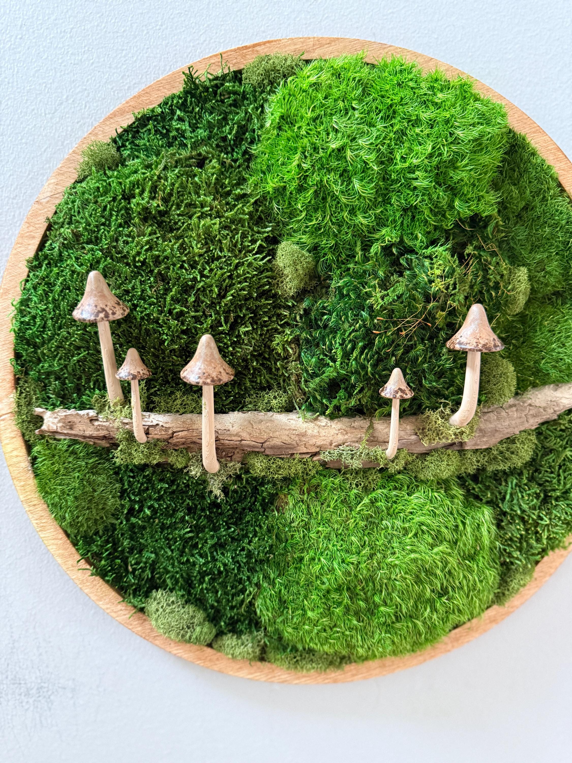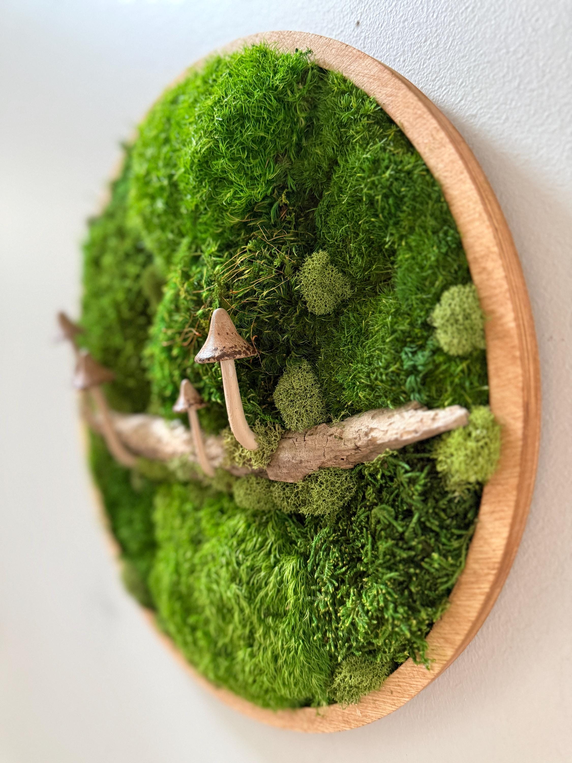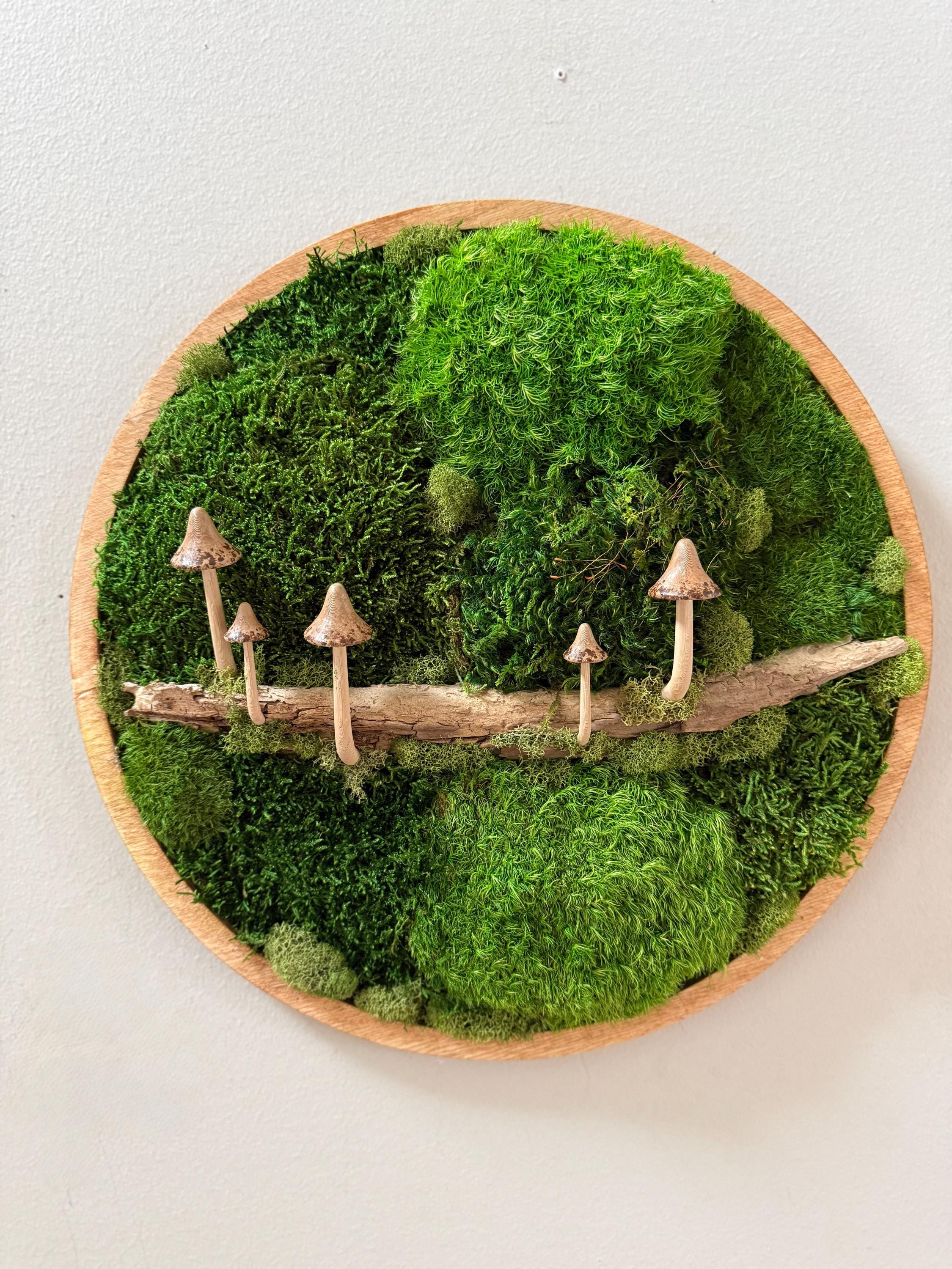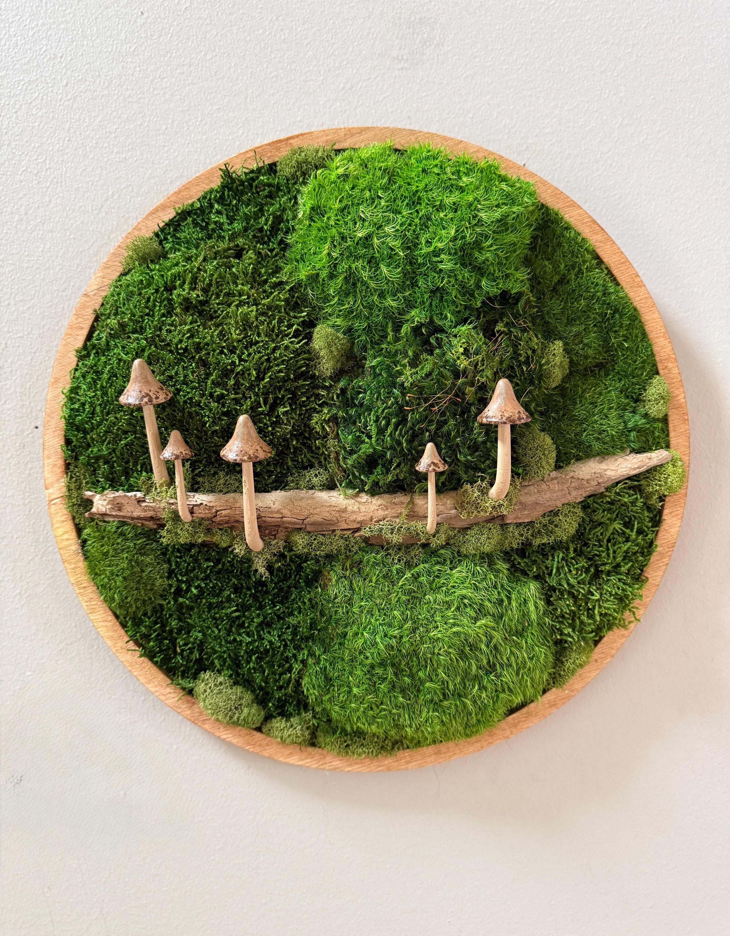 Real preserved mosses and some hand-painted mushrooms bring serenity to a space without any maintenance. All materials are preserved to stay looking beautiful forever. Set in a circular wood frame.