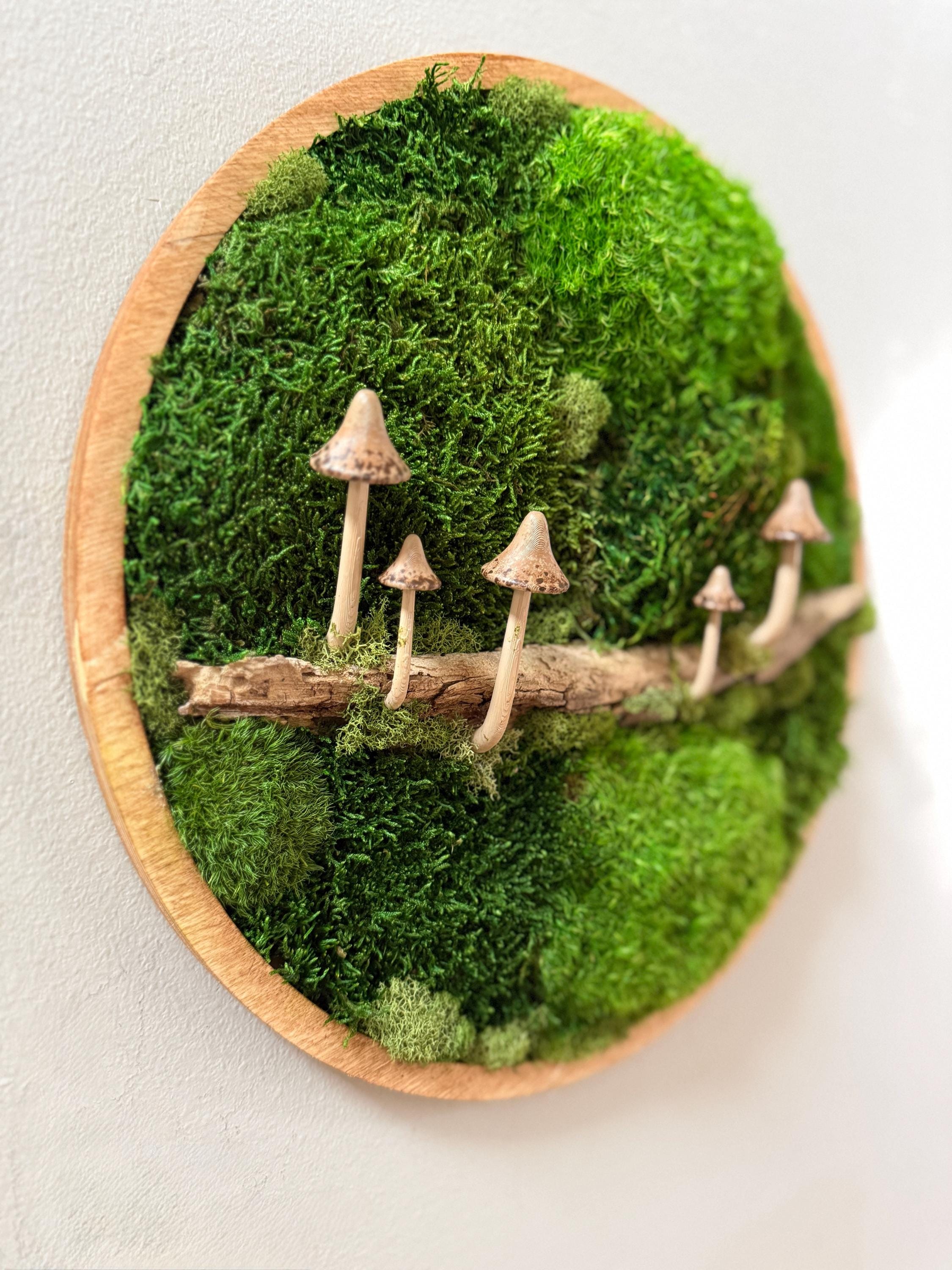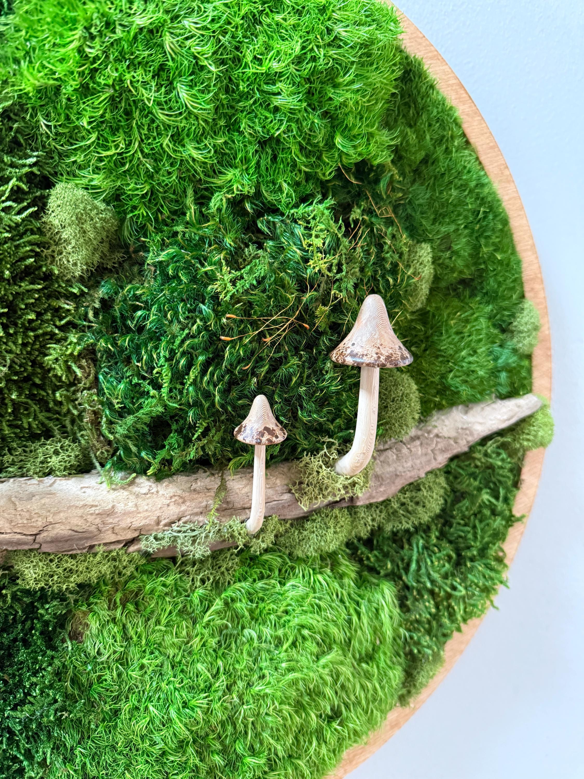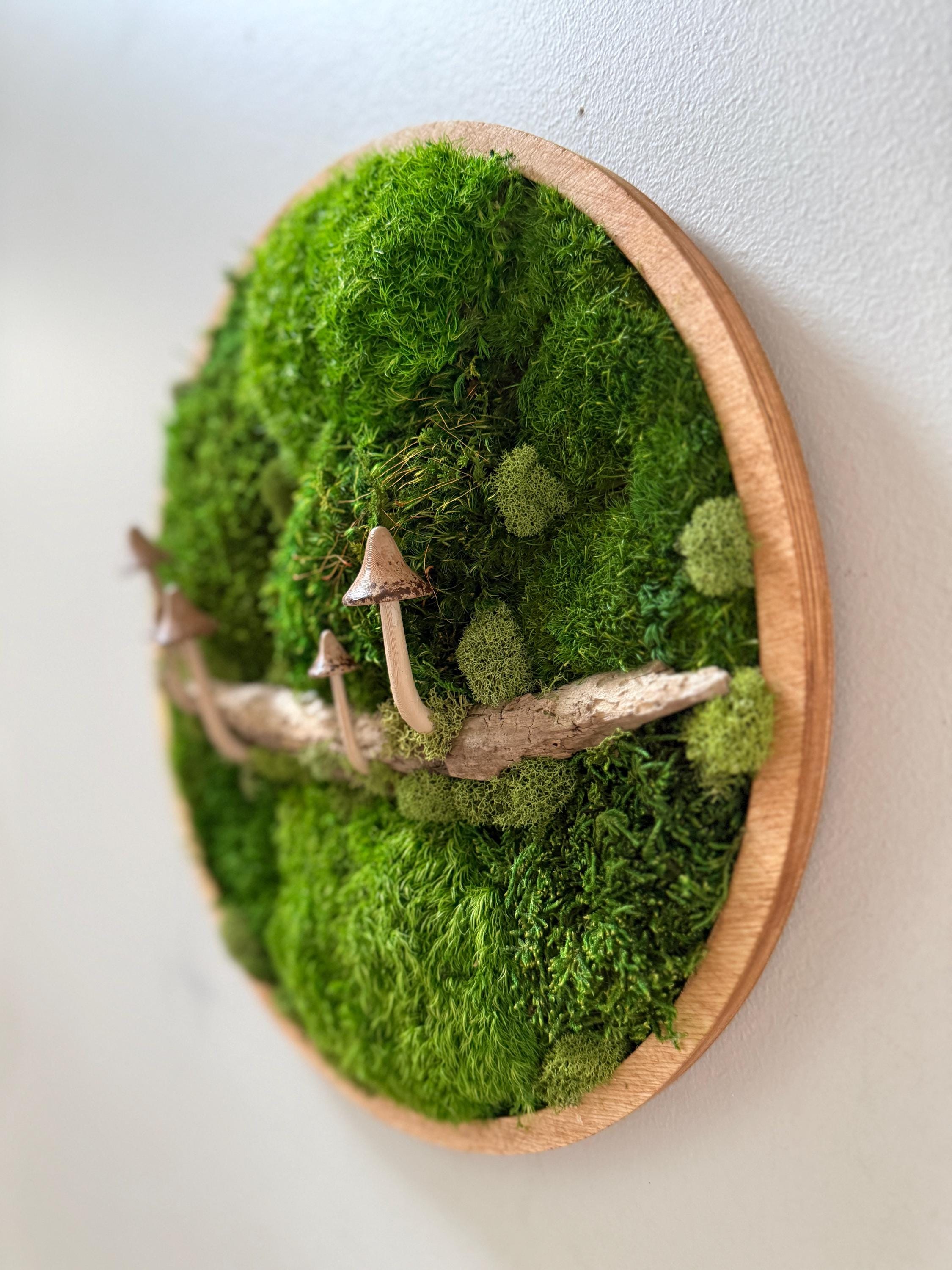 Real preserved mosses and some hand-painted mushrooms bring serenity to a space without any maintenance. All materials are preserved to stay looking beautiful forever. Set in a circular wood frame.