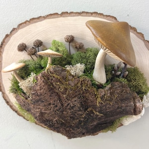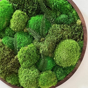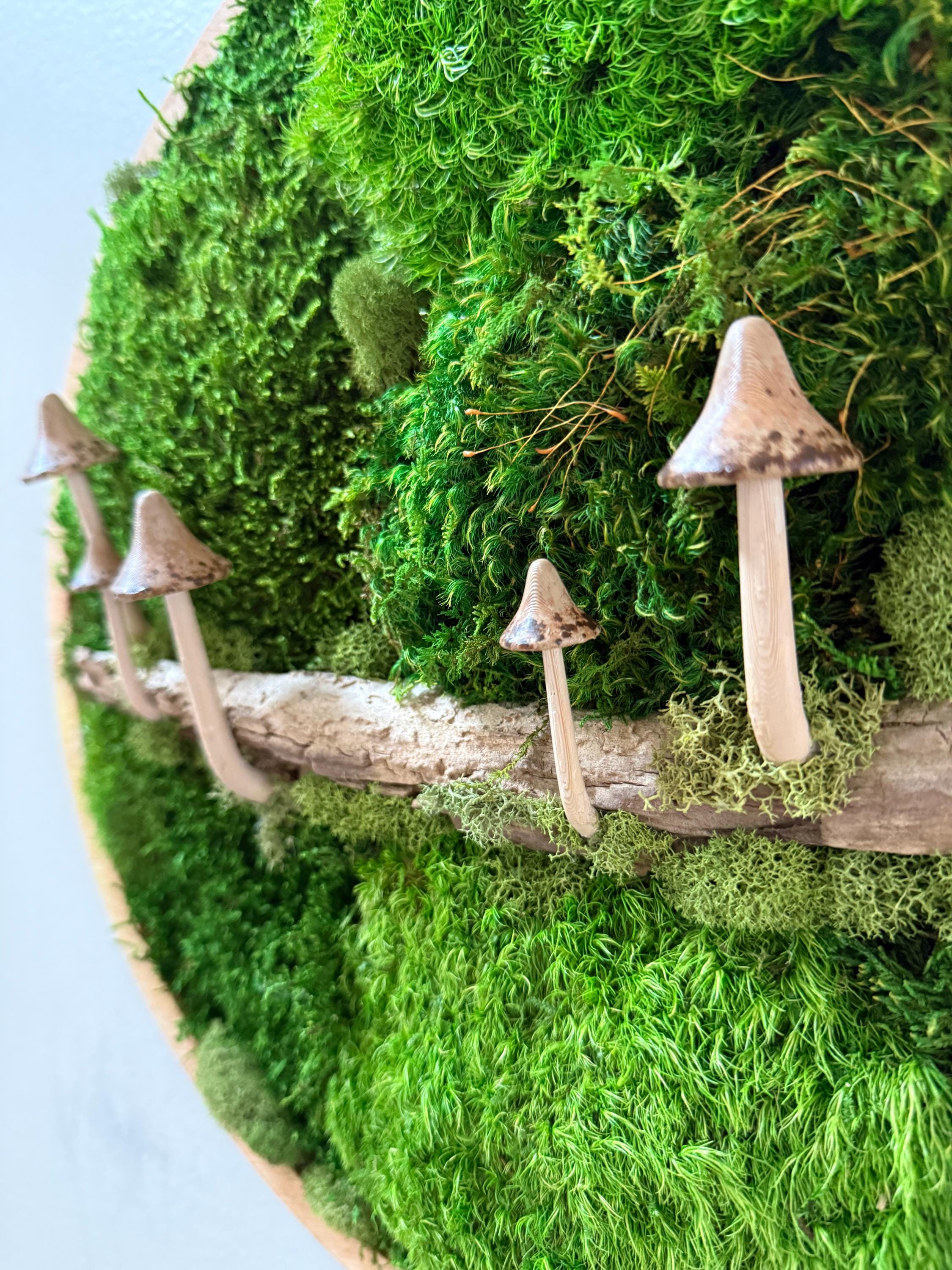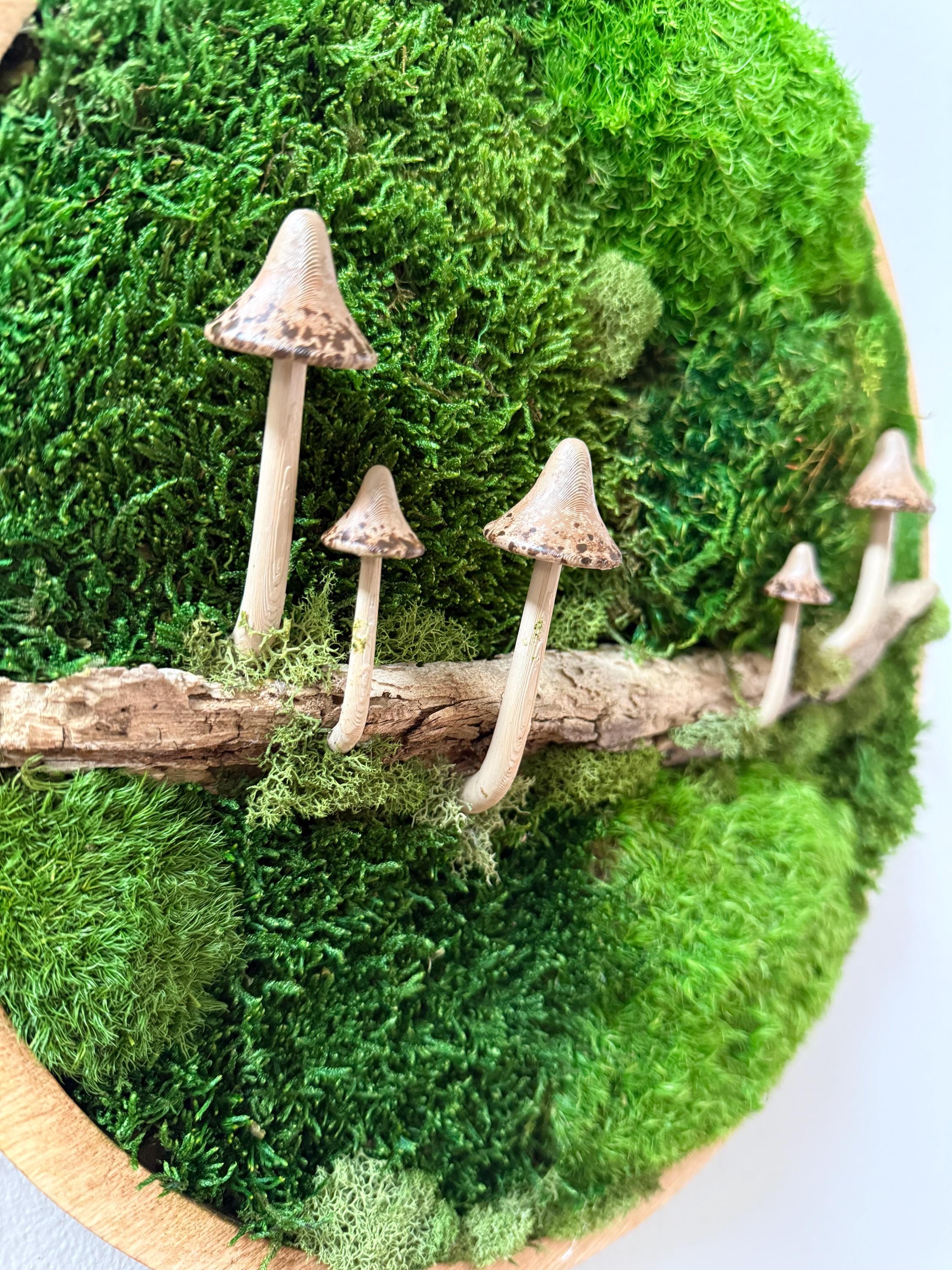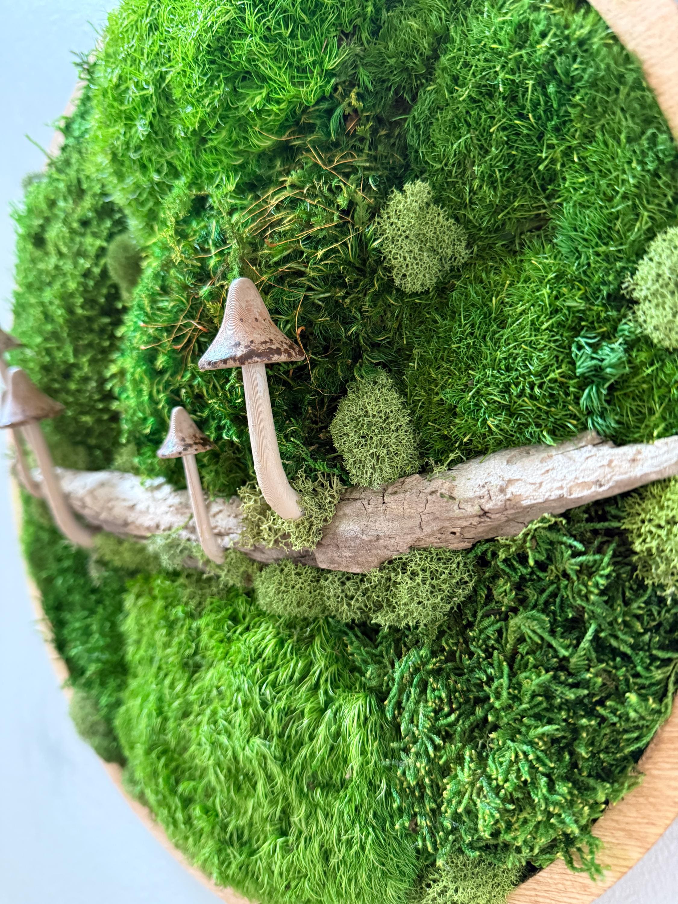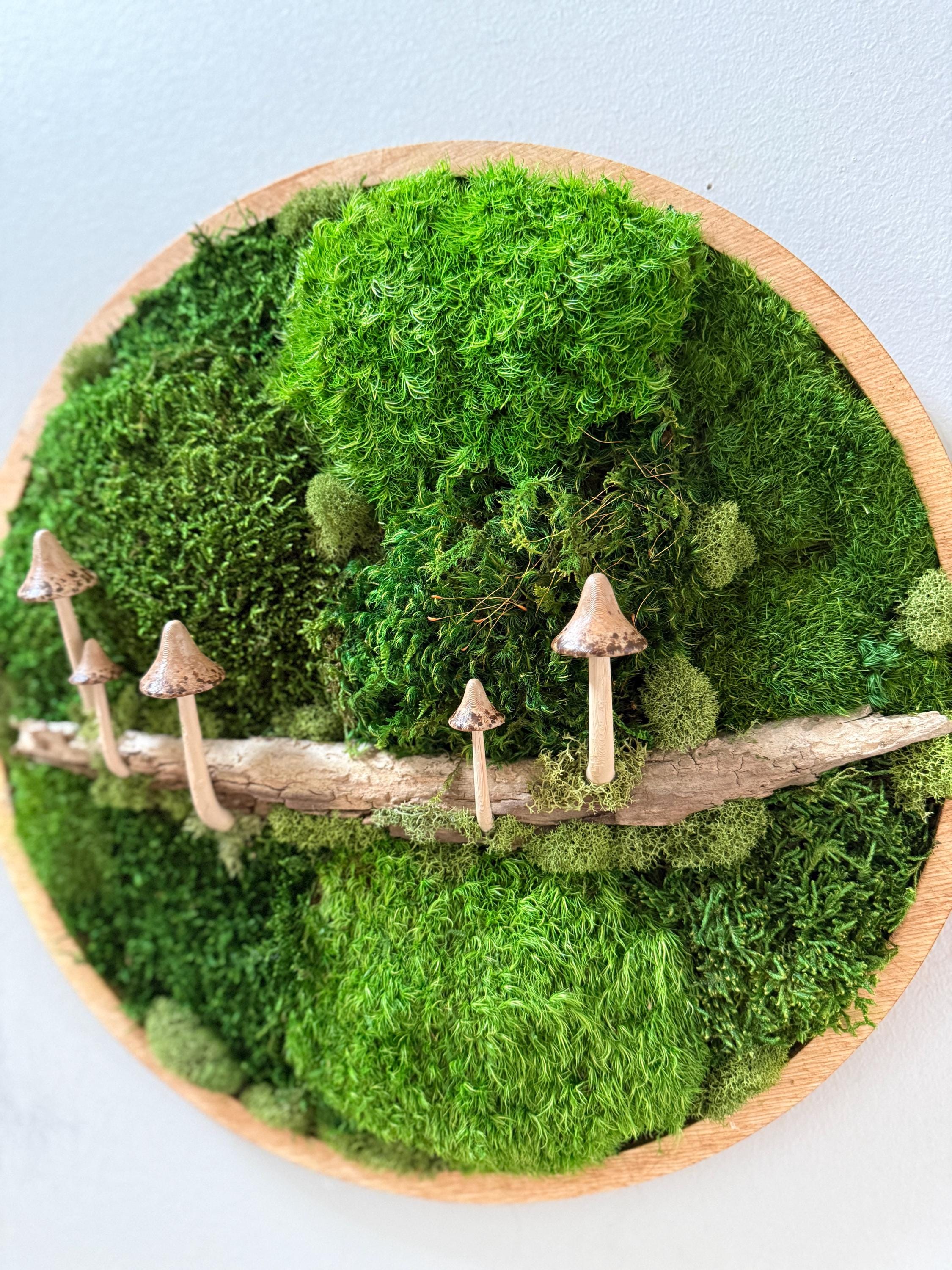 Real preserved mosses and some hand-painted mushrooms bring serenity to a space without any maintenance. All materials are preserved to stay looking beautiful forever. Set in a circular wood frame.